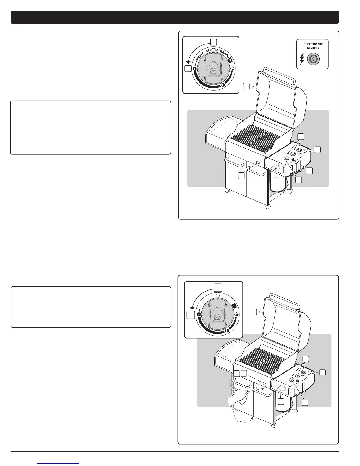 E) Push and hold the electronic ignition button. You will hear it sparking (5).