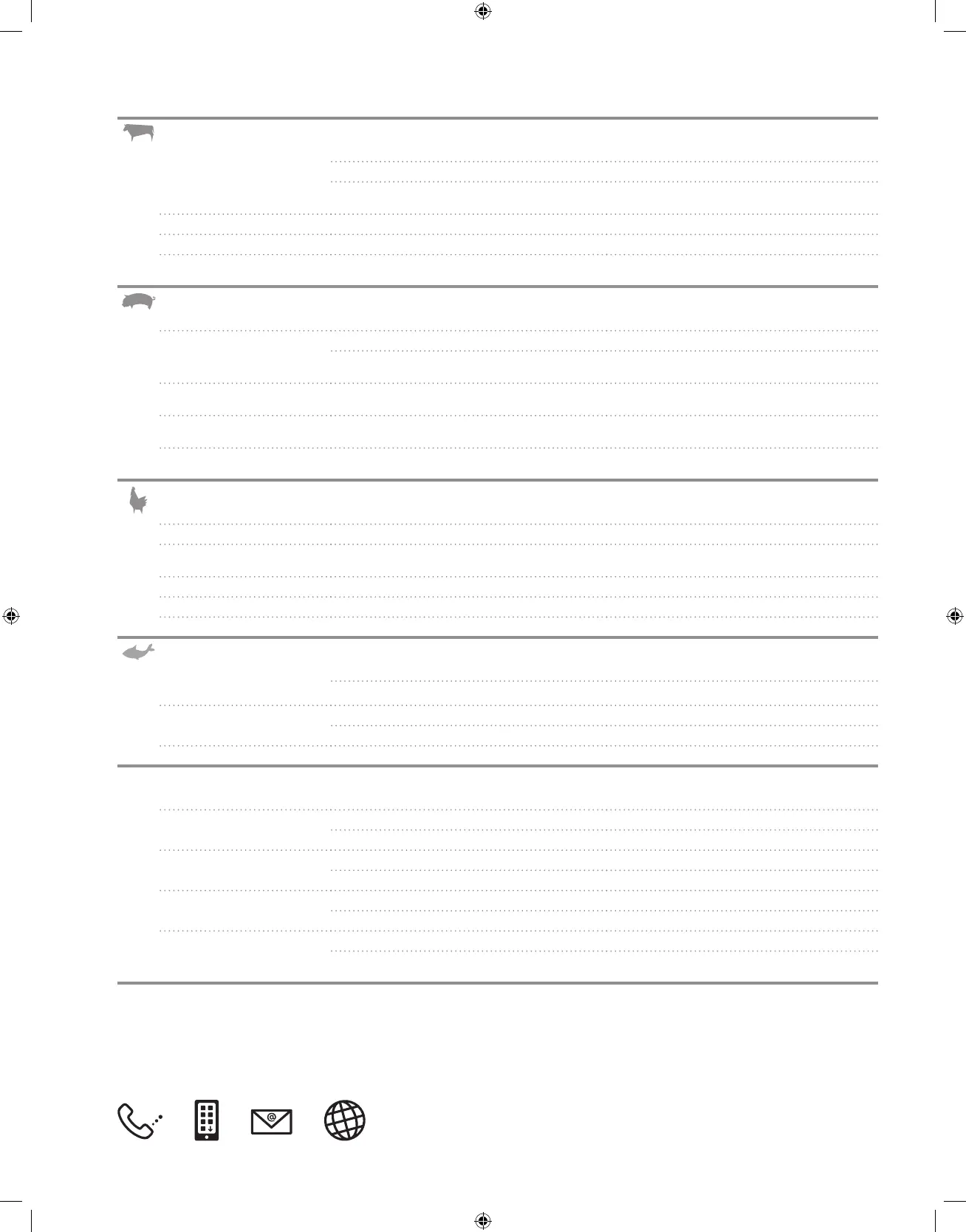 Los cortes, grosores, pesos y tiempos de cocción anteriores son sólo directrices orientativas. Factores como la altitud, el viento y la temperatura exterior pueden afectar