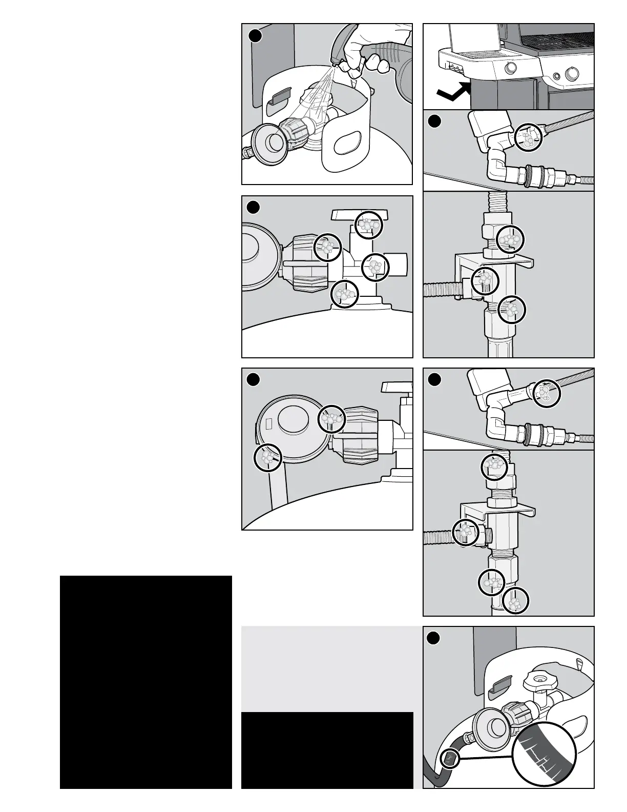 • Where the gas hose connects to the bulkhead.