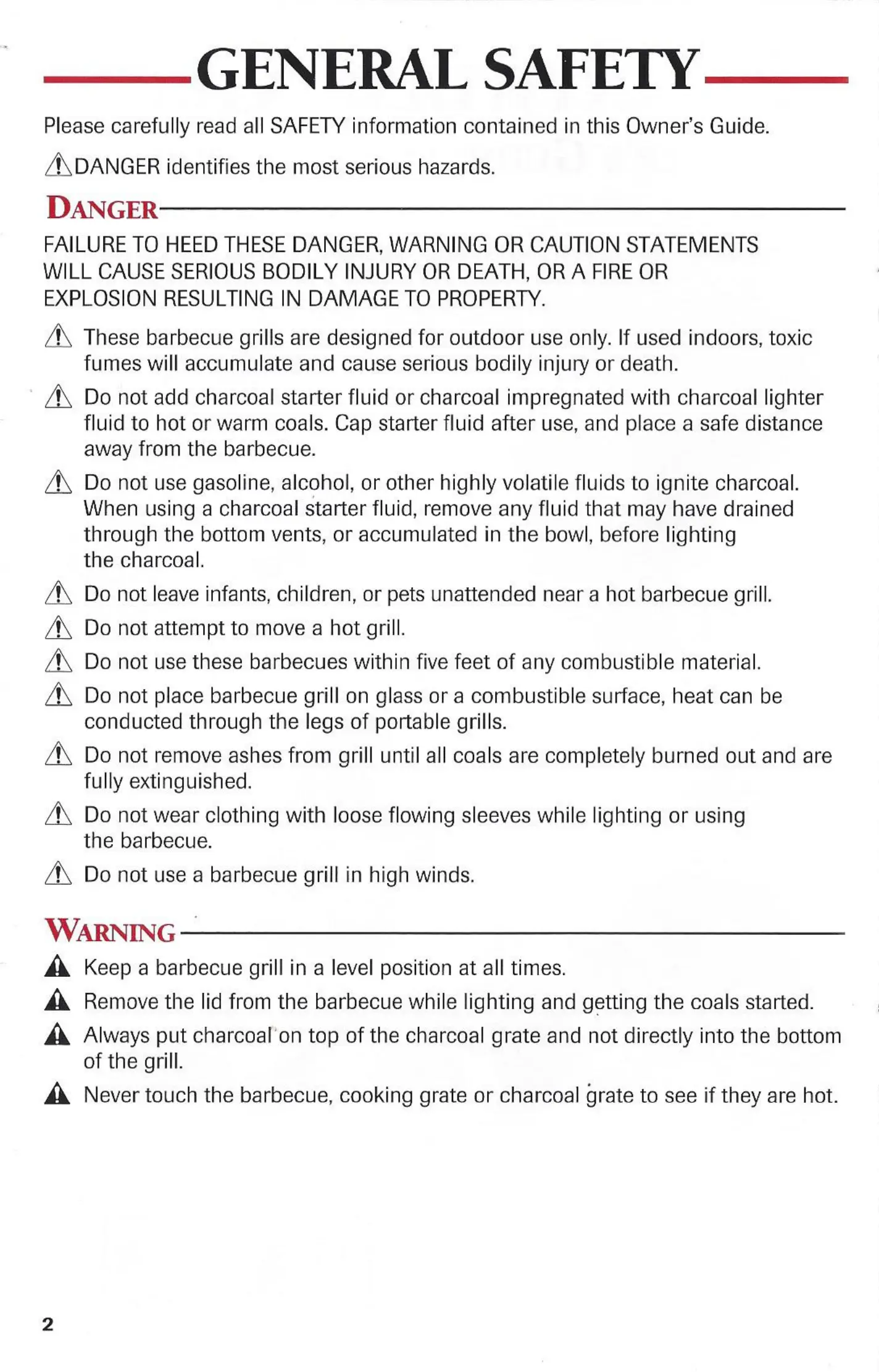 fluid to hot or warm coals. Cap starter fluid after use, and place a safe distance