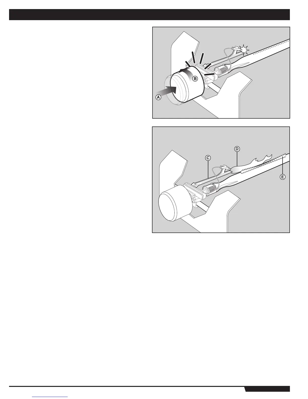 This action will generate gas flow and a spark to the burner lighting tube (C). You will