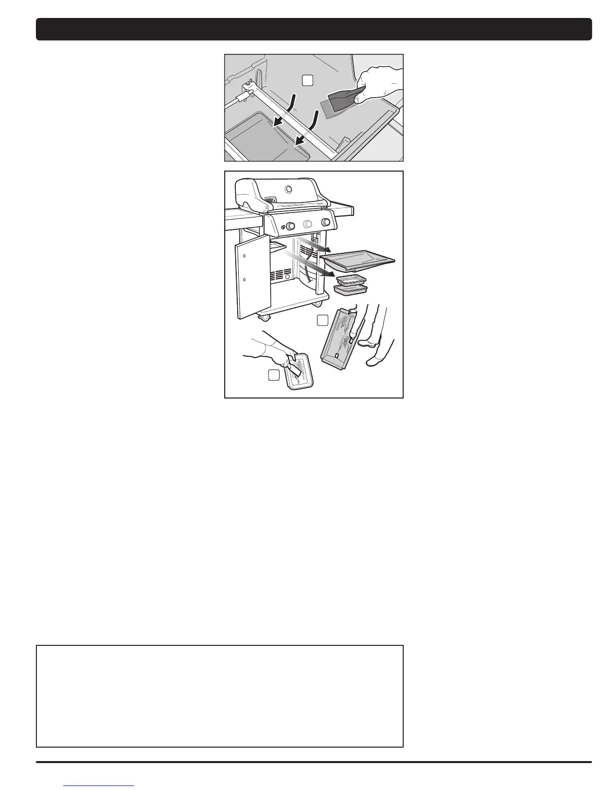 • Check that the areas under the control panel and the slide-out grease tray are free from debris that might