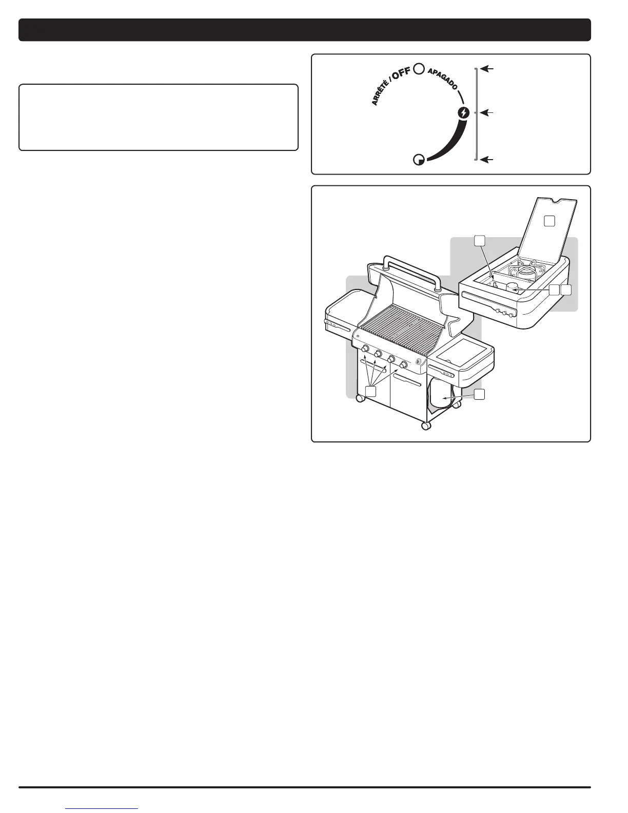 B) Check that the side burner valve is turned off (2) (Push control knob in and turn