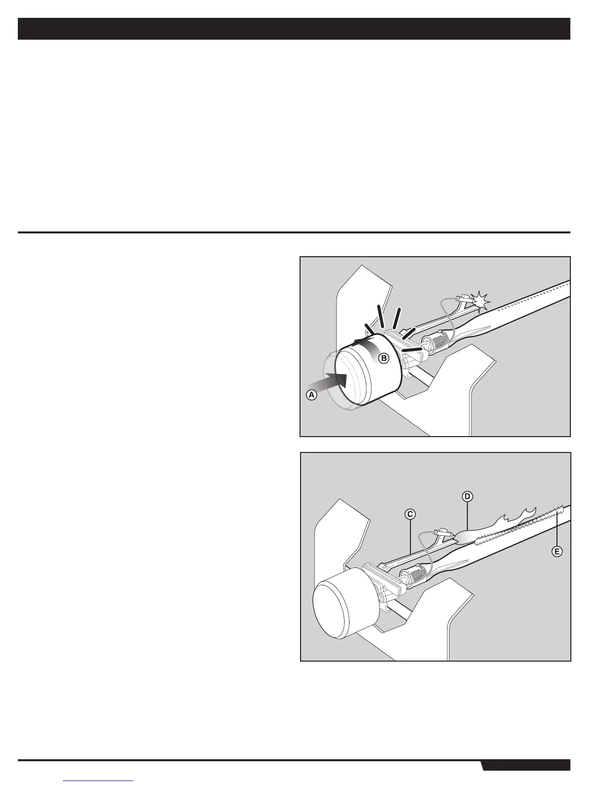 This action will generate gas flow and a spark to the burner lighting tube (C). You will