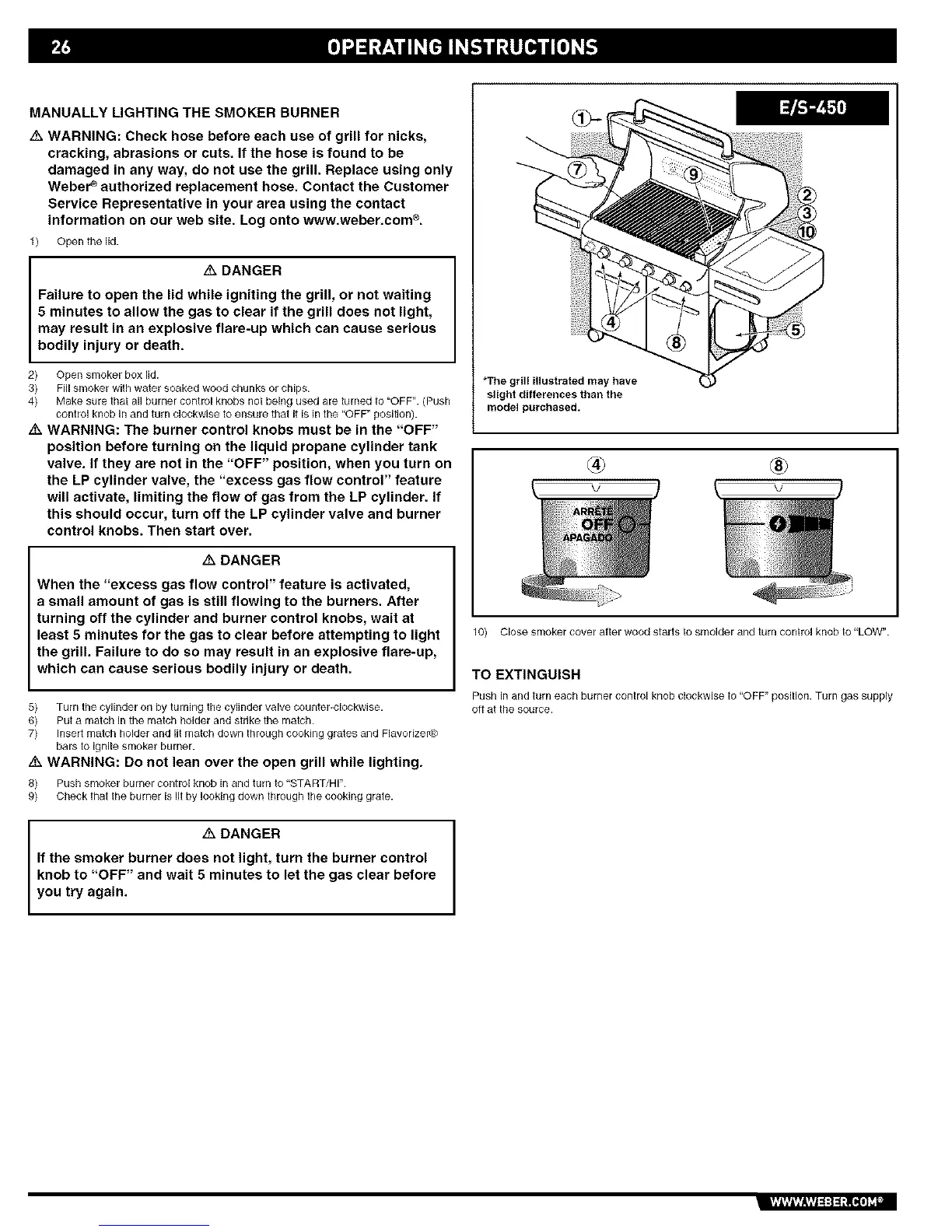 .'I'.WARNING: Check hose before each use of grill for nicks,
