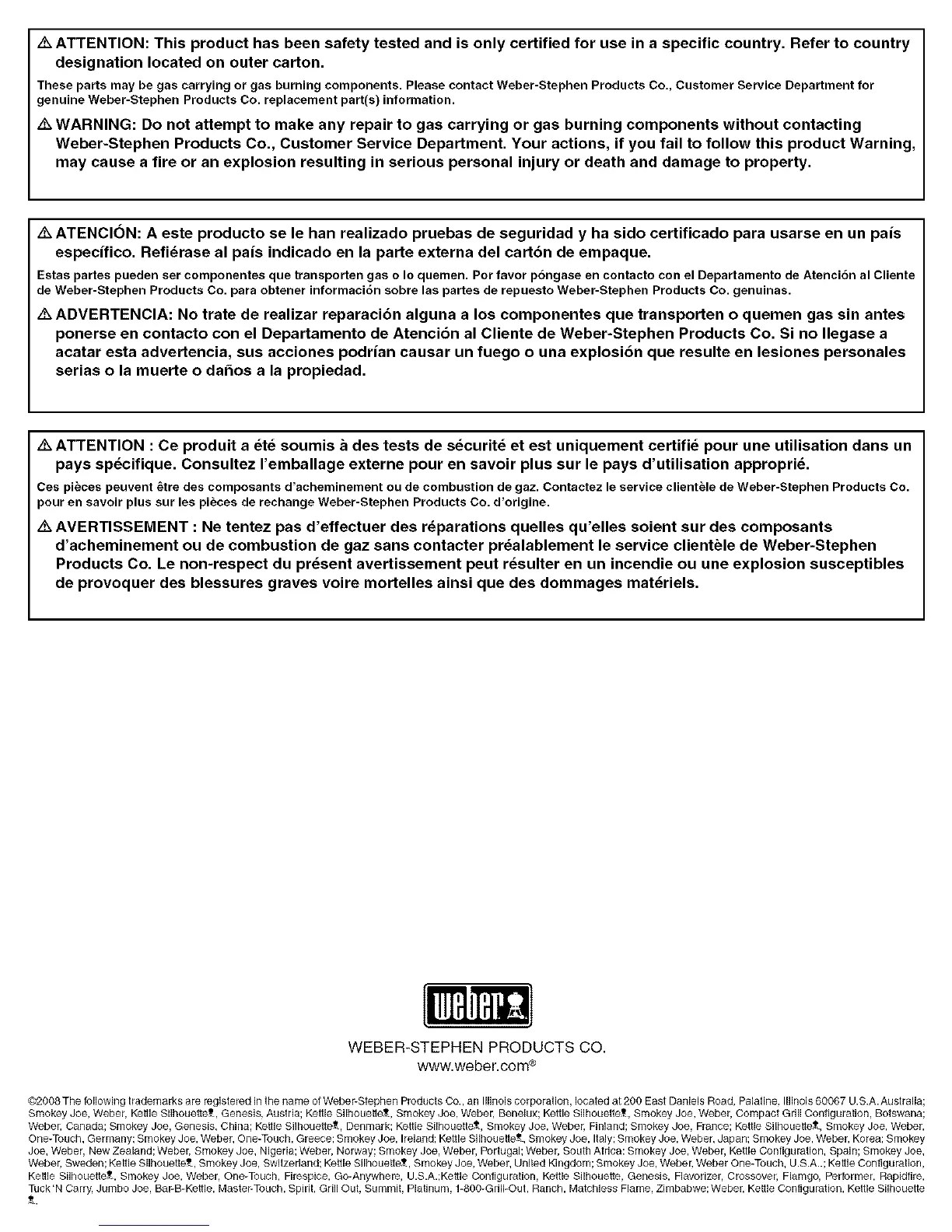 @2008 The following trademarks are registered in the name of Weber-Stephen Products Co., an Illinois corporation, located at 200 East Daniels Road, Palatine, Illinois 60067 U.S.A.Australia;