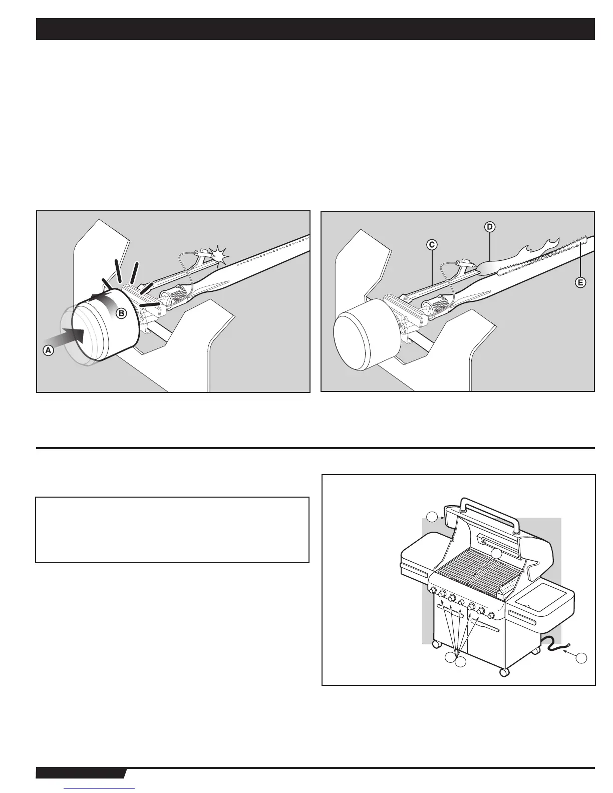 Each control knob has its own igniter electrode built in. To create a spark you must push the control knob in (A) and turn to “START/High” (B).