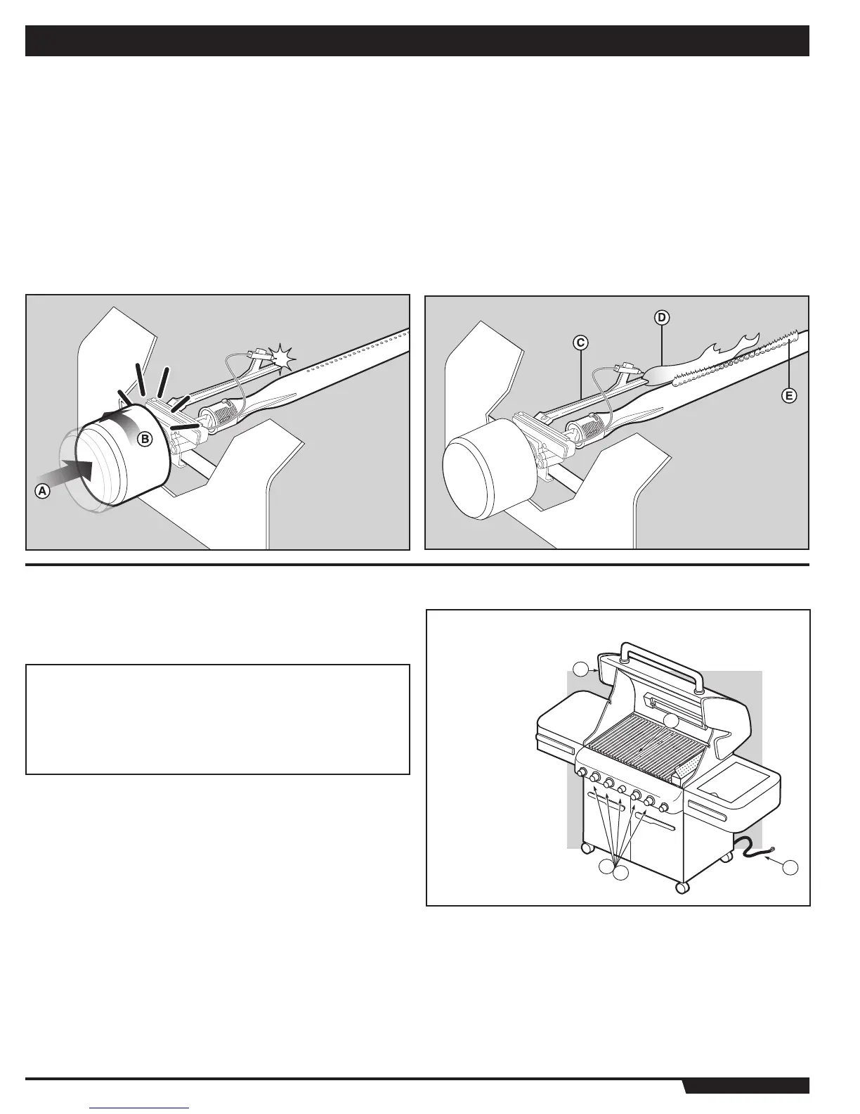 Mantenga presionada la perilla de control durante dos segundos adicionales después del “chasquido”. Esto permitirá que el gas fluya a todo lo largo del tubo quemador (E)