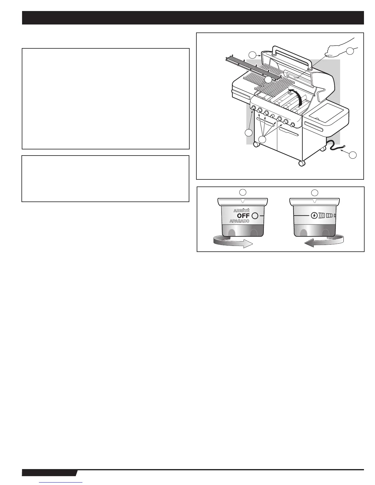 Presione la perilla de control del quemador del asador y gírela en la dirección de las