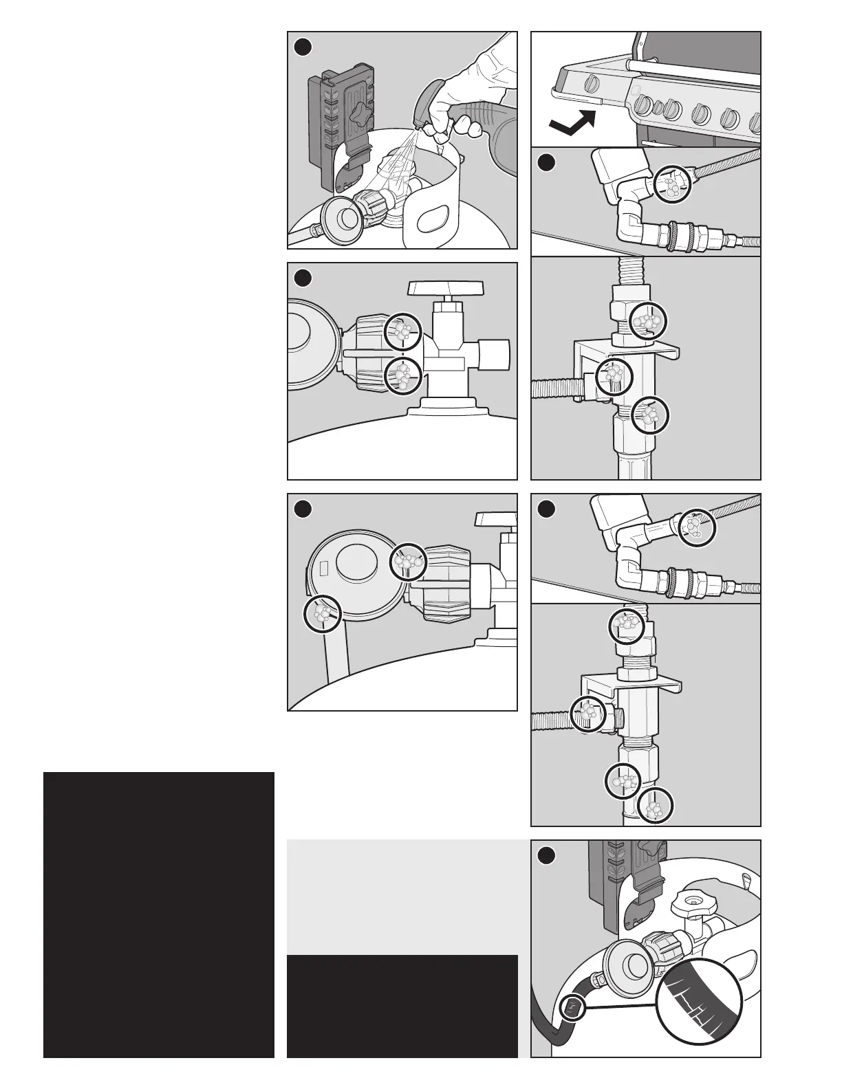 • Where the gas hose connects to the bulkhead.