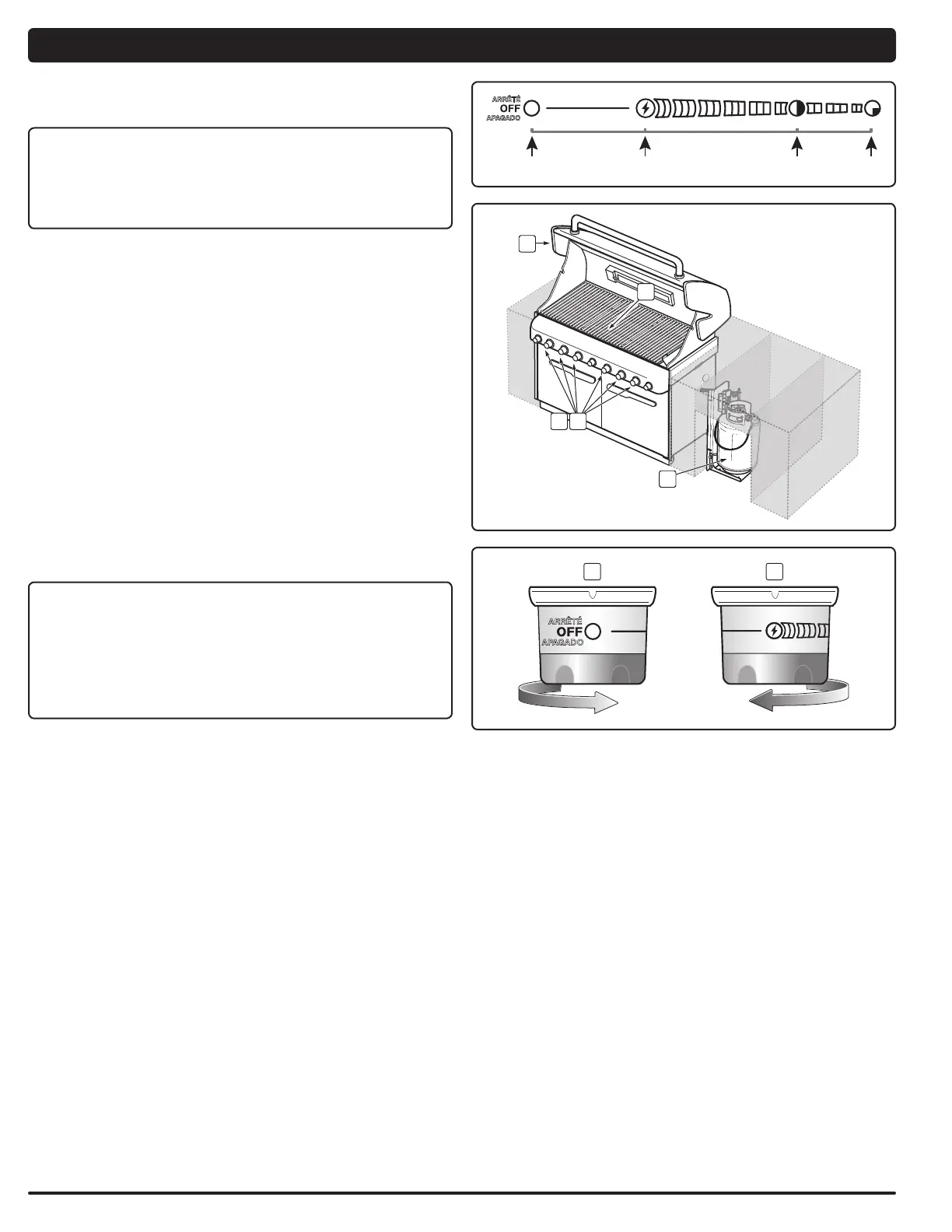 B) Make sure all burner control knobs are turned off (2). (Push control knob in and