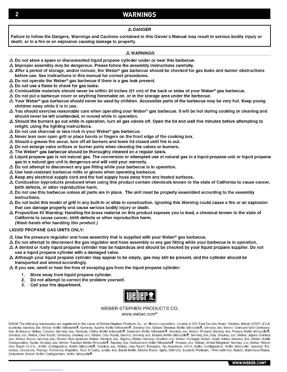 ©2008 The following trademarks are registered in the name of Weber-Stephen Products Co., an Illinois corporation, located at 200 East DanJels Road, Palatine, Illinois 60067 U.S.A.