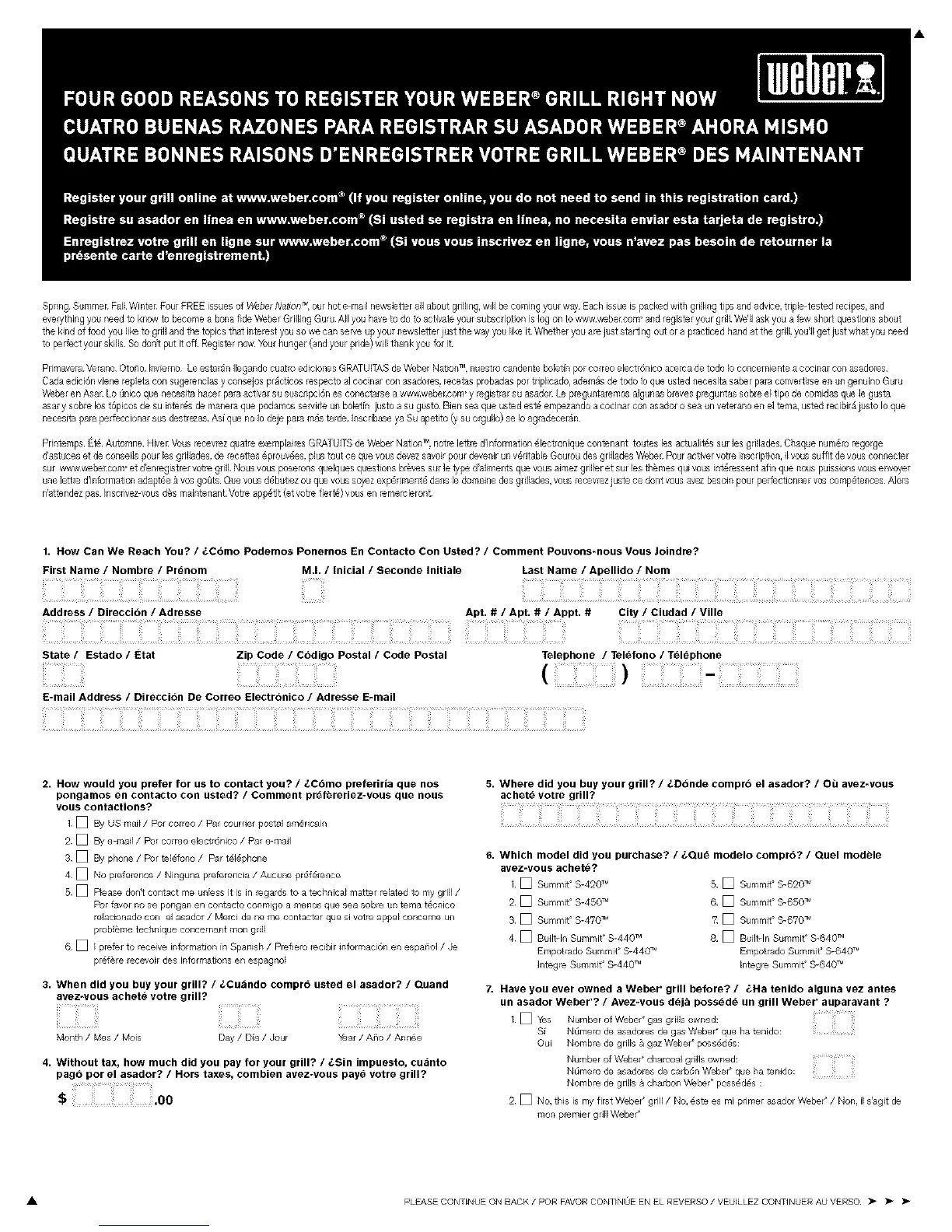 Spring Summer Fall,Winte_ Four FREEissues of WeberNation_ our hot e-mailnewsletter allabout grilling,will be comingyour way,Each issue is packedwith grilling tips and advice,triple-tested recipes and