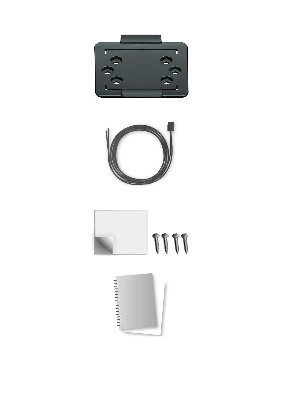 Fixings - 1 adhesive strip, 4 self-tapping screws and a cleaning tissue