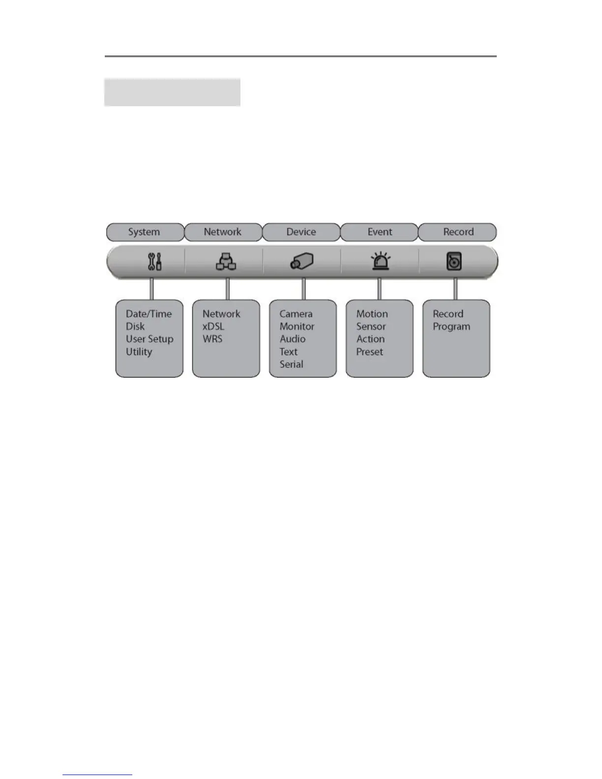 The menu structure will be shown like below image, and each menu setting method descriped