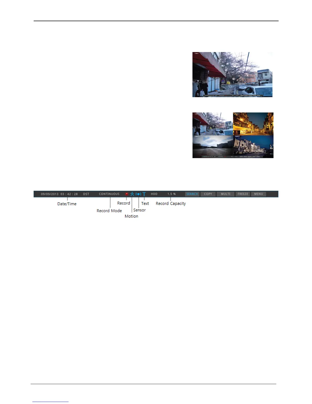 The status bar from monitoring screen shows DVR’s current status which includes the following: Date/Time,