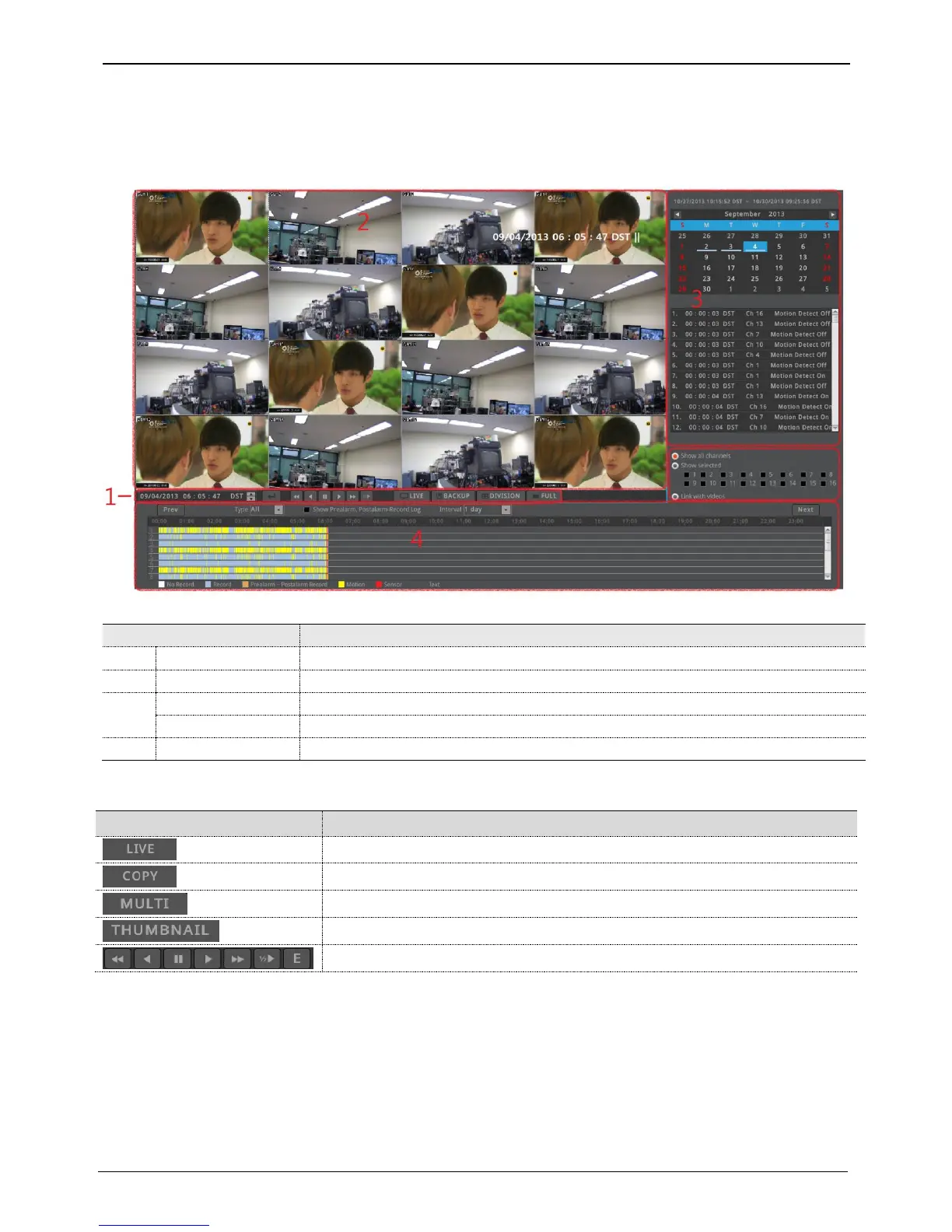 Displays the info of the unit and search the playback sections.