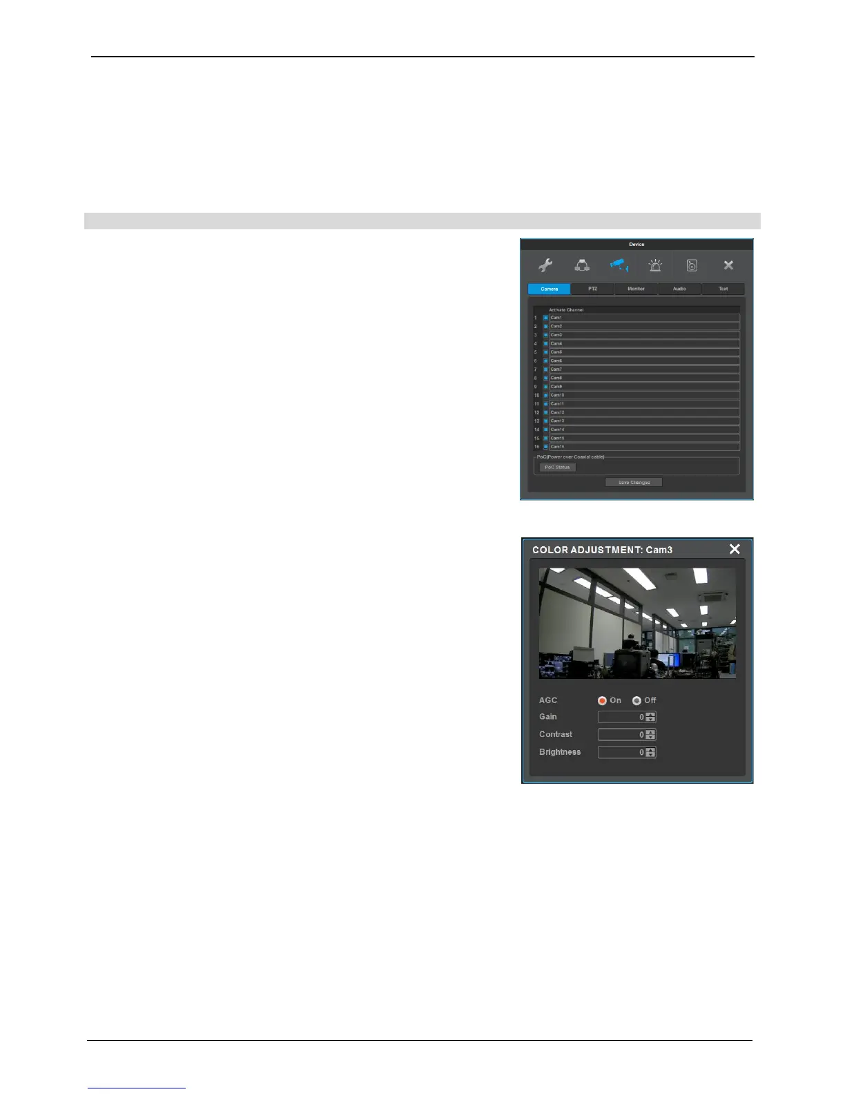 In Device setup, user can configure camera, monitor, audio, text, serial which are connected to DVR.