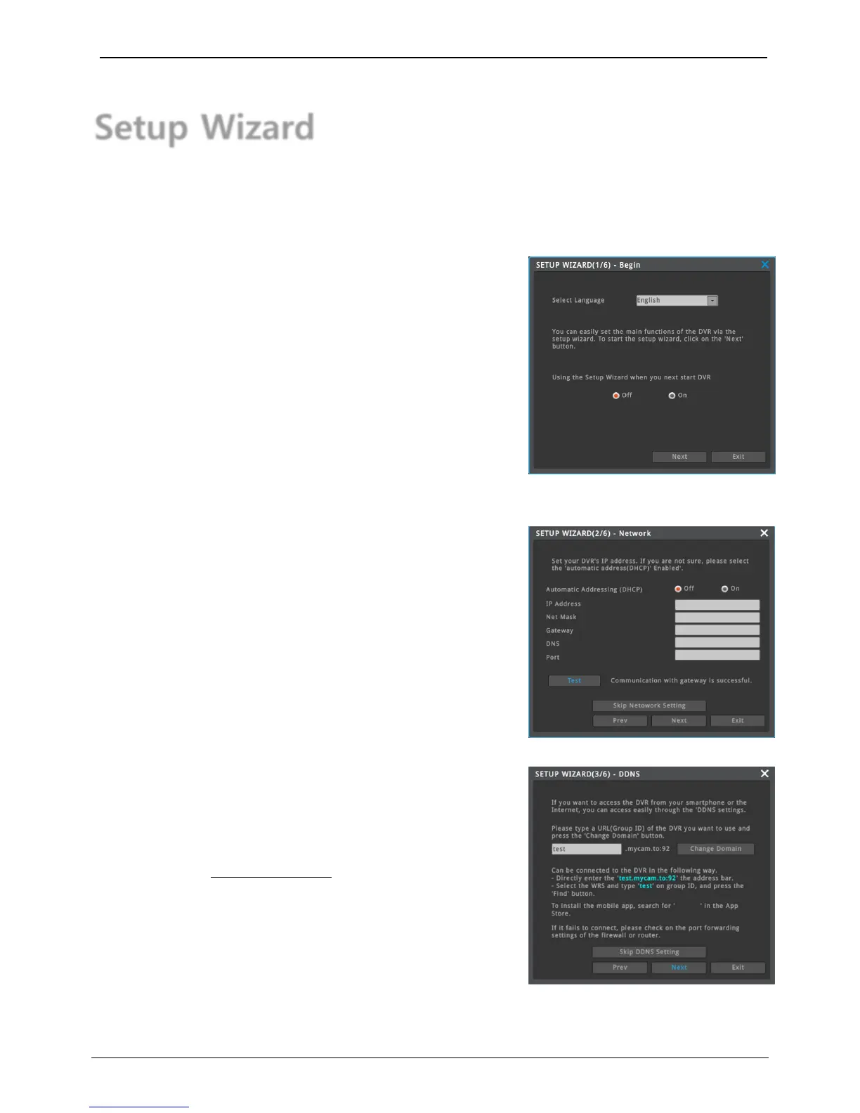 Setup Wizard can help user setup “language, network, DDNS, time, harddisk, record mode” with ease.