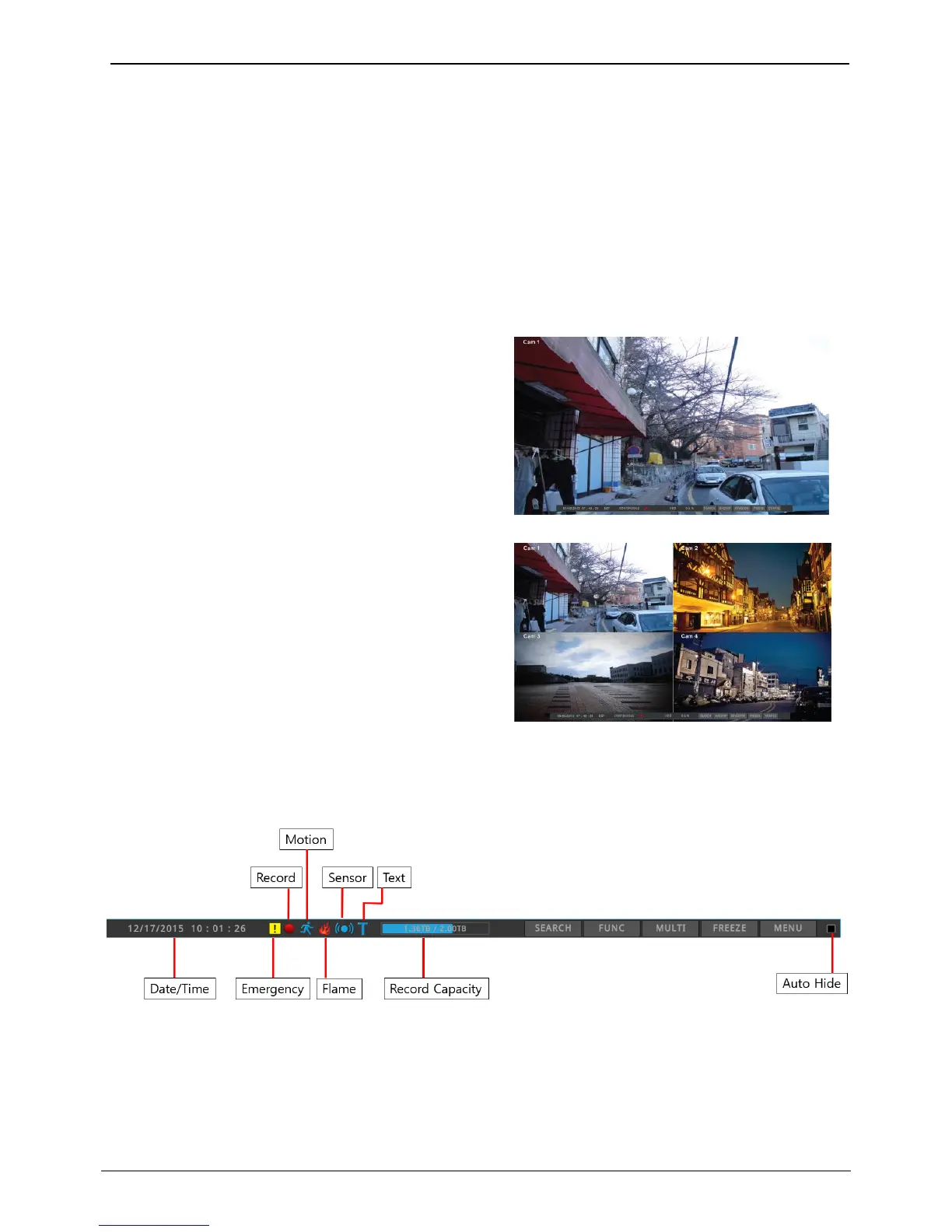 Status bar shows current date/time, emergency record, record, motion detection, fire, sensor, text, disk capacity,