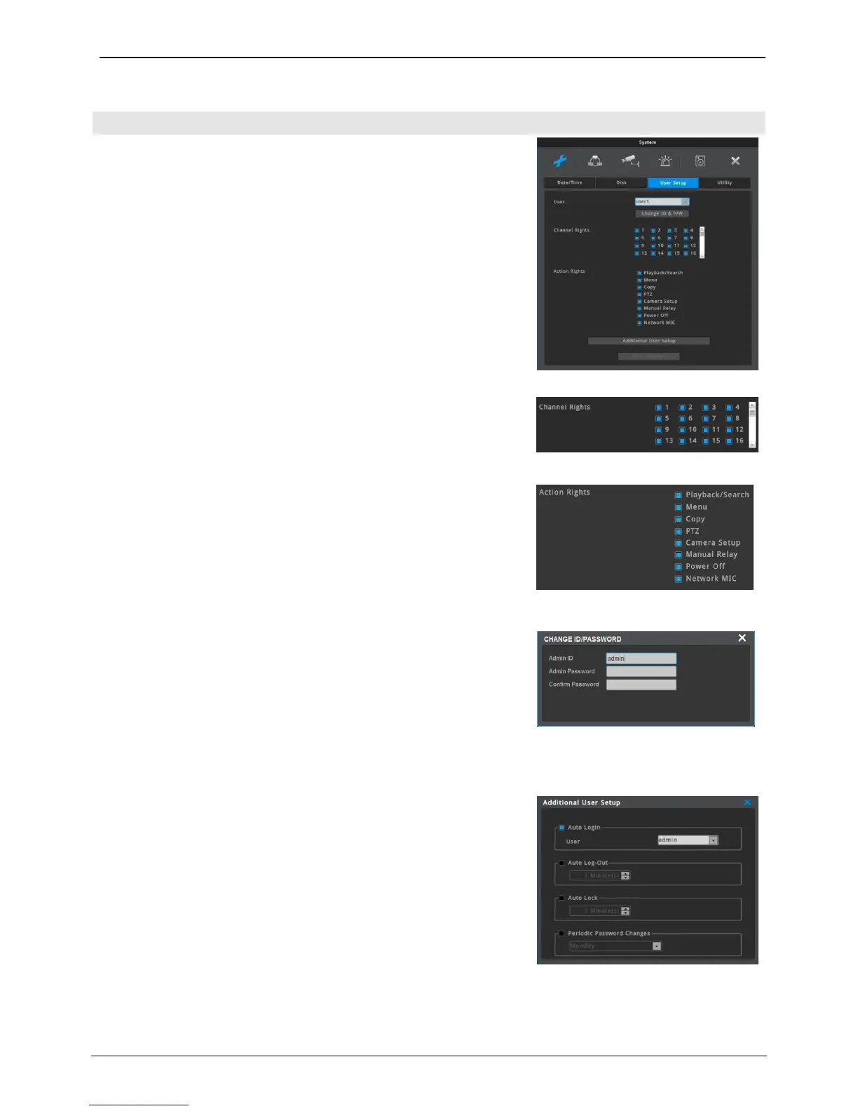 The action rights to each function (Playback/Search, Menu, Copy, PTZ,