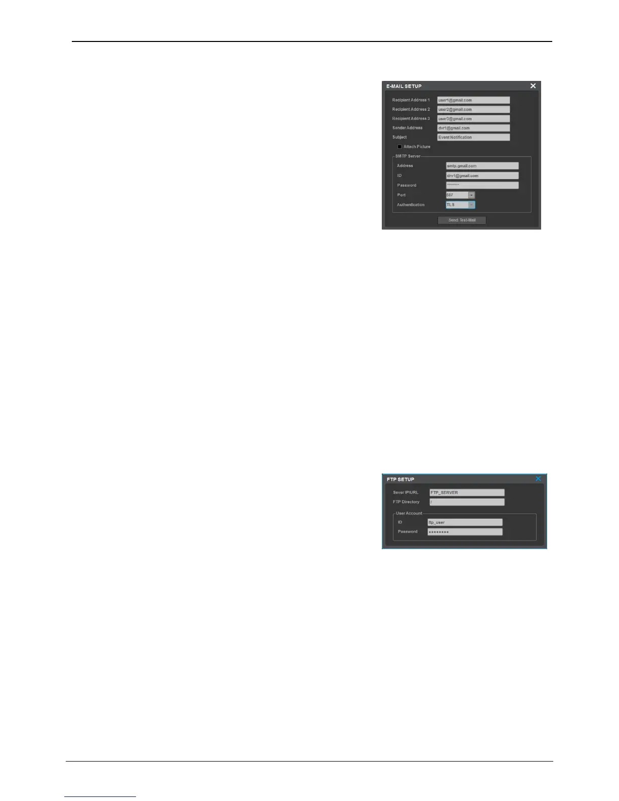 When sensor, motion detector and video loss occur, relevant event info with channel video will be sent to an