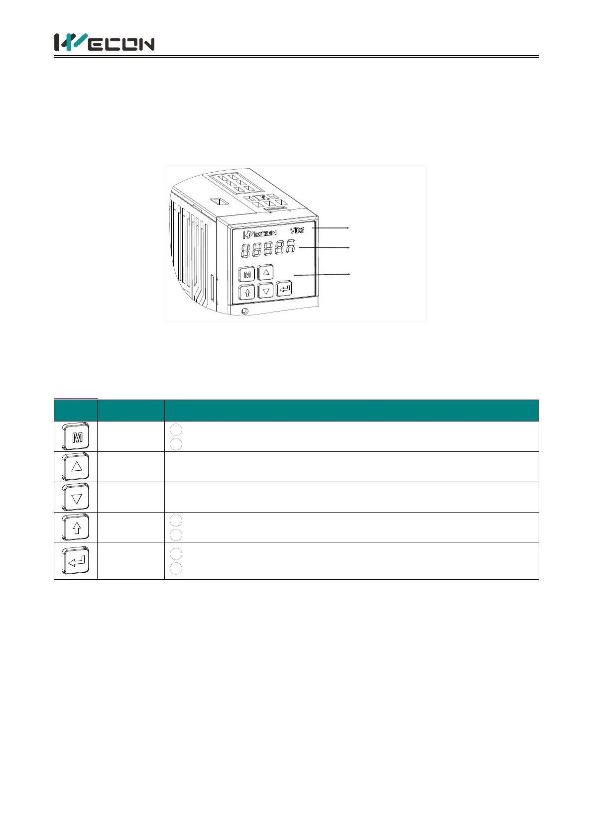 The panel of the VD2 series servo drive consists of a display (5-digit LED nixie tube) and keys, which