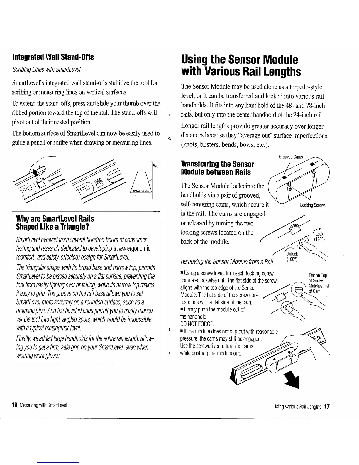 Wedge Innovations SmartLevel - Integrated Wall Stand-Offs; Using the Sensor Module with Various Rail Lengths; Transferring the Sensor Module between Rails