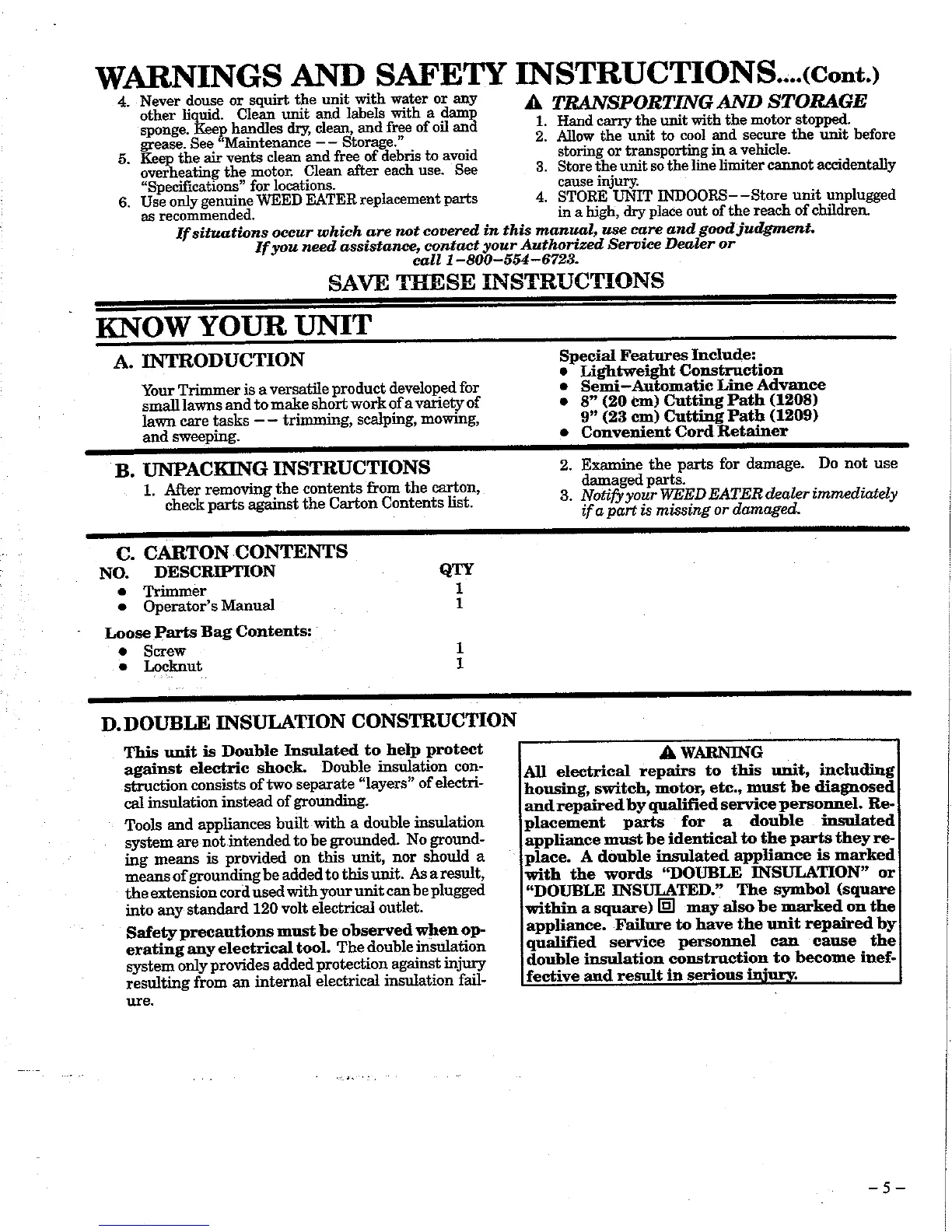 Weed Eater 1209 - Know Your Unit; Introduction and Unpacking; Carton Contents and Insulation