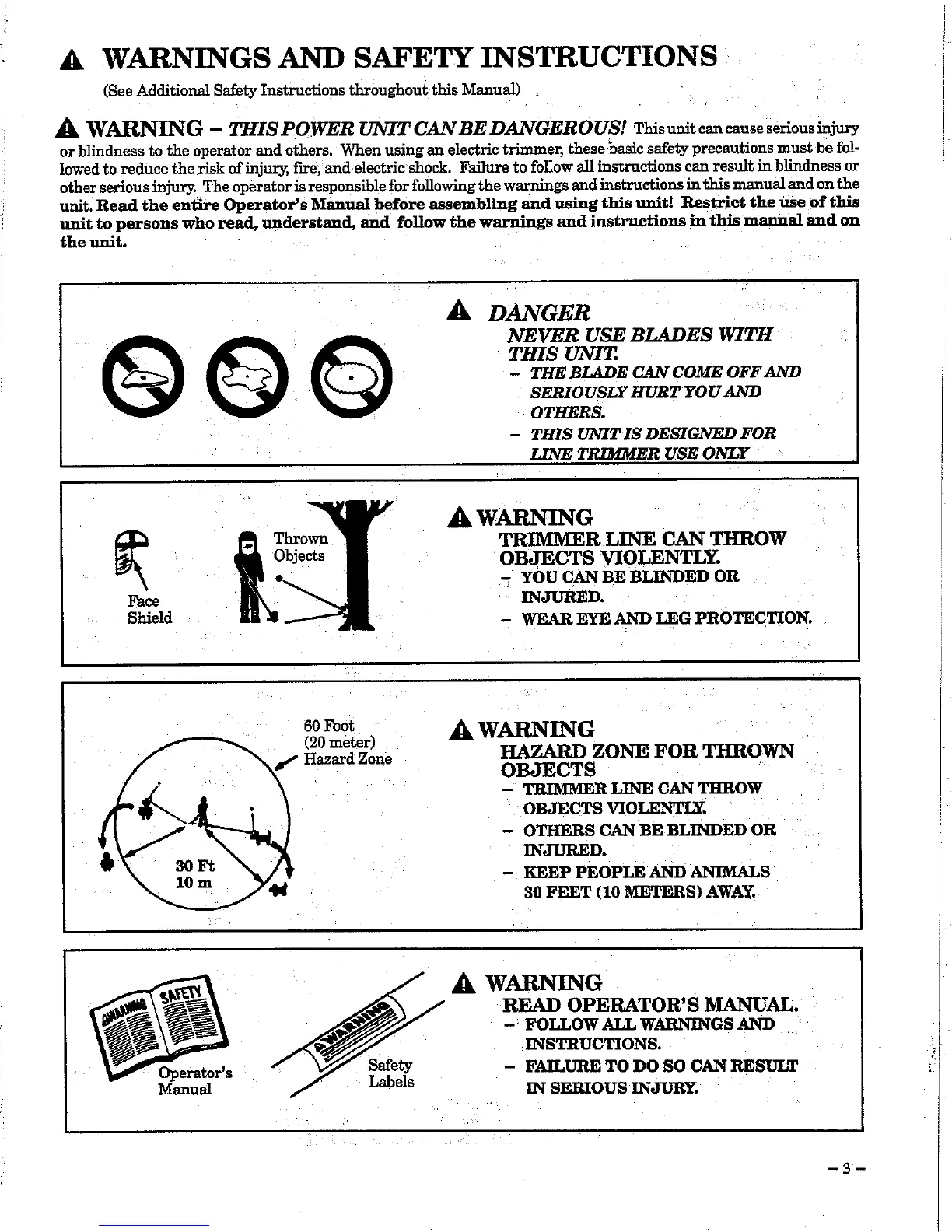Weed Eater 1212 - WARNINGS AND SAFETY INSTRUCTIONS; DANGER: BLADES WITH UNIT; WARNING: TRIMMER LINE HAZARD; WARNING: HAZARD ZONE FOR THROWN OBJECTS