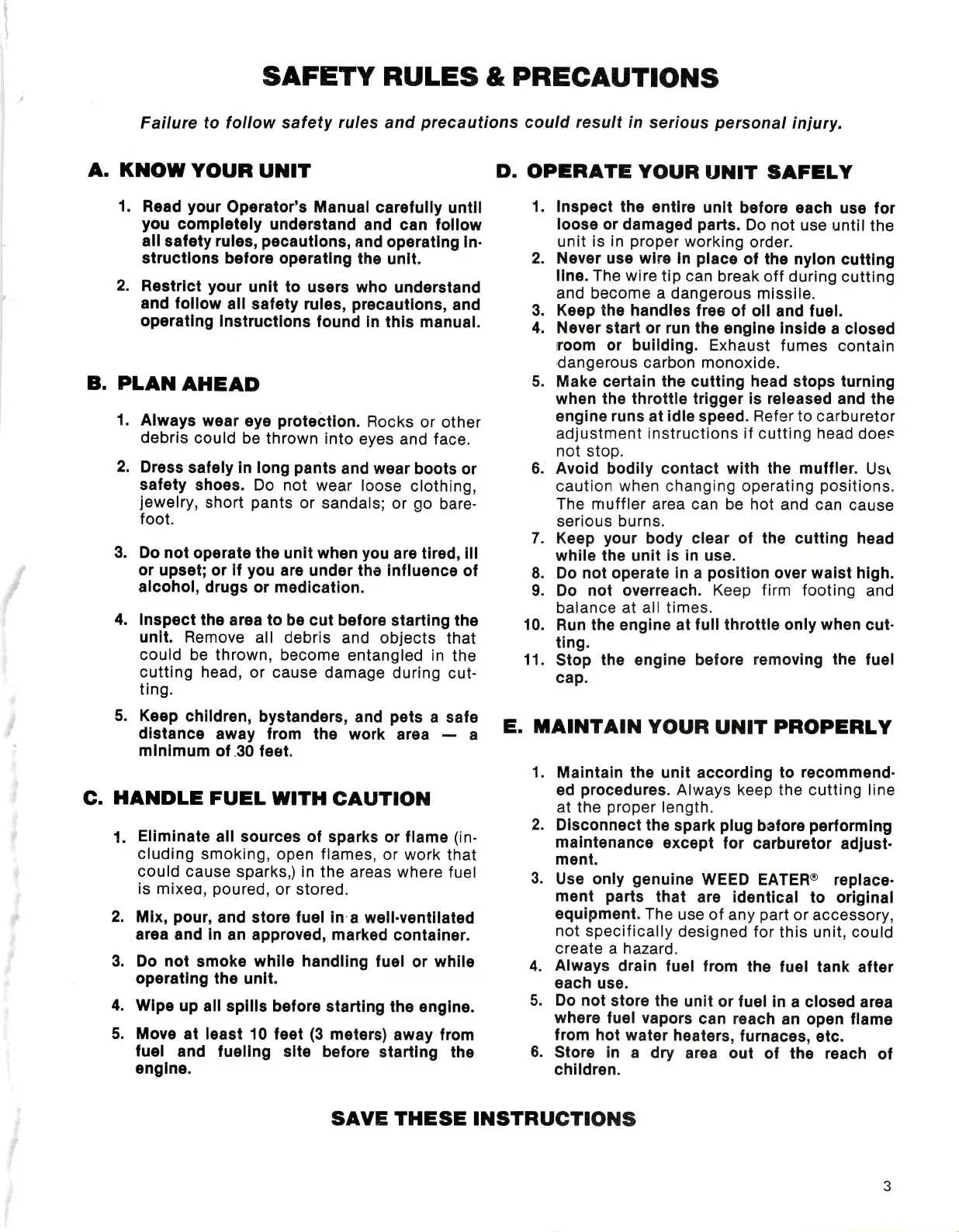 Weed Eater 1700 - Safety Rules and Precautions; Know Your Unit; Plan Ahead; Handle Fuel With Caution