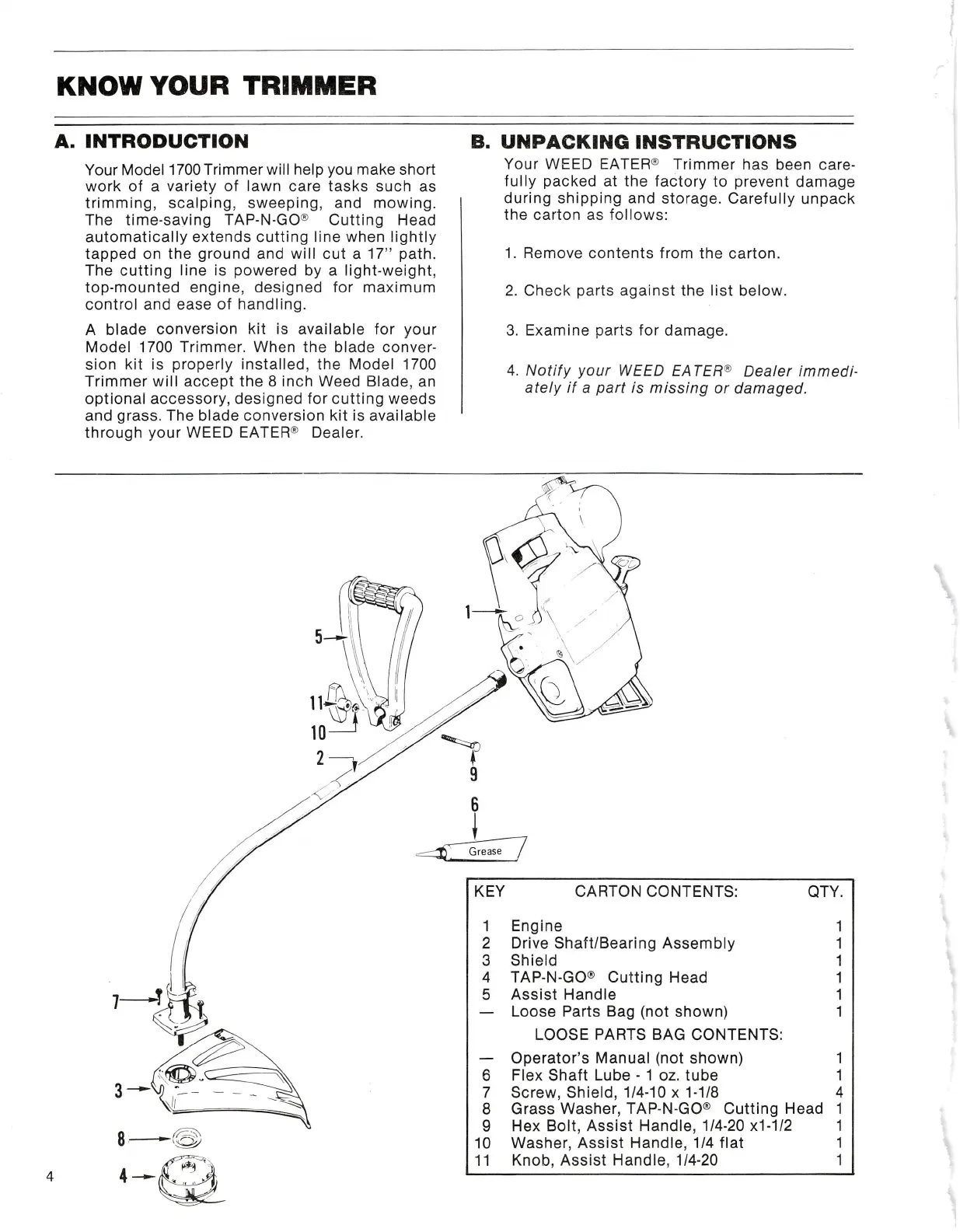 Weed Eater 1700 - Know Your Trimmer; Introduction; Unpacking Instructions