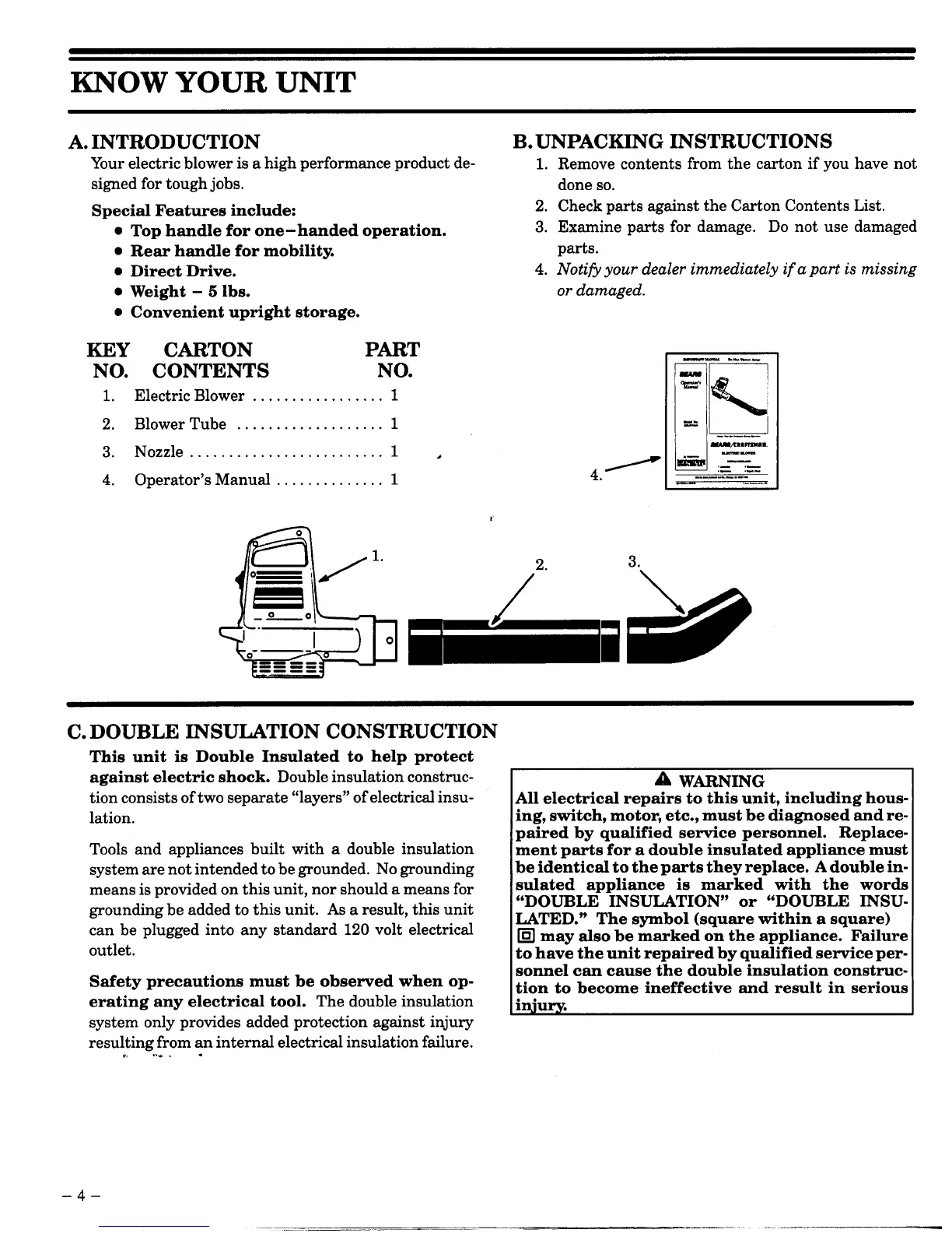 Weed Eater 2510 - Know Your Unit; Introduction to the Blower; Unpacking and Inspection; Double Insulation Construction