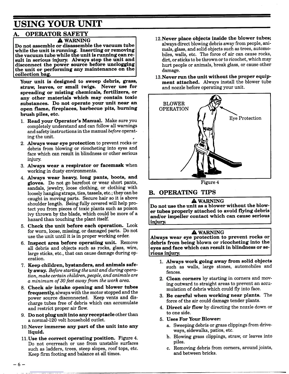Weed Eater 2510 - Using Your Blower; Operator Safety During Use; Operating Tips and Techniques