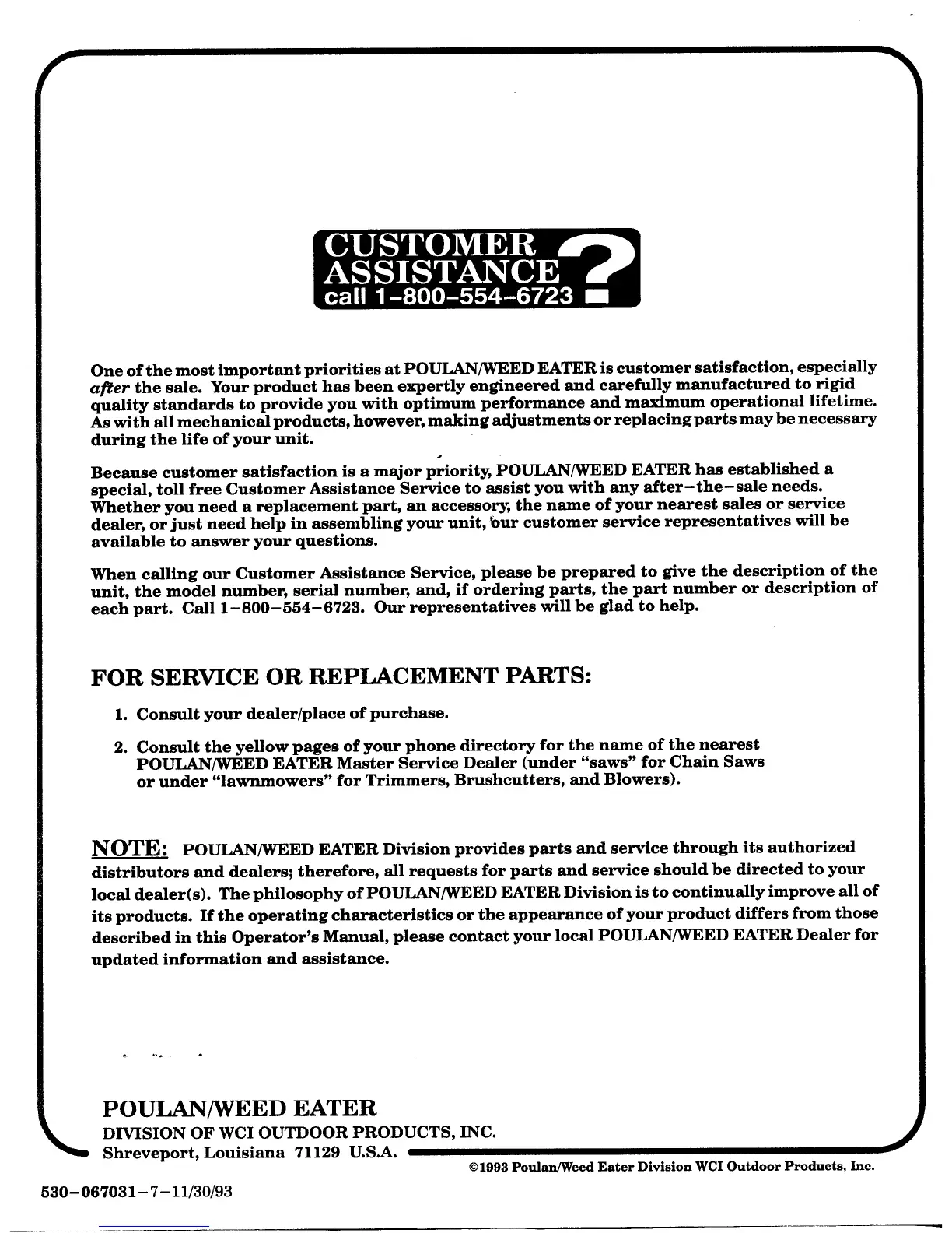 Weed Eater 2510 - Customer Assistance Information; Service and Replacement Parts