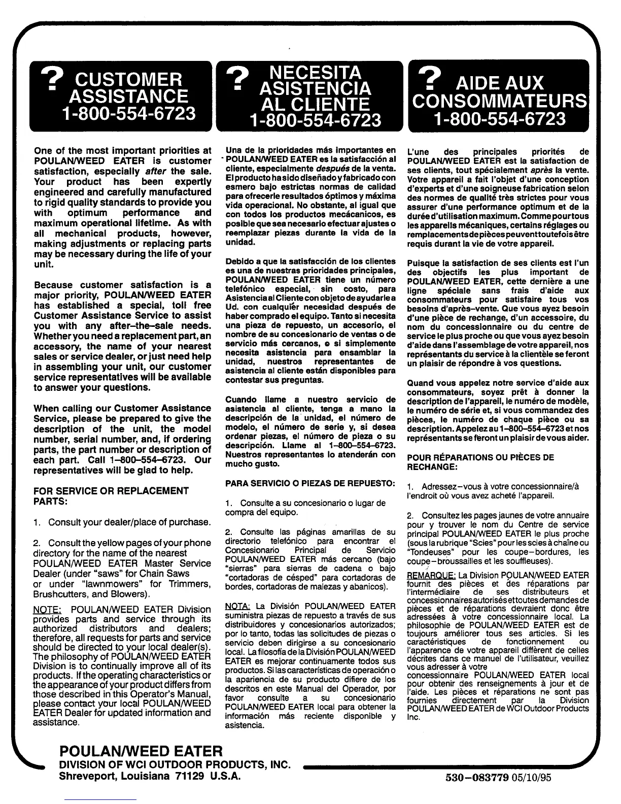 Weed Eater 2540 - CUSTOMER ASSISTANCE; FOR SERVICE OR REPLACEMENT PARTS