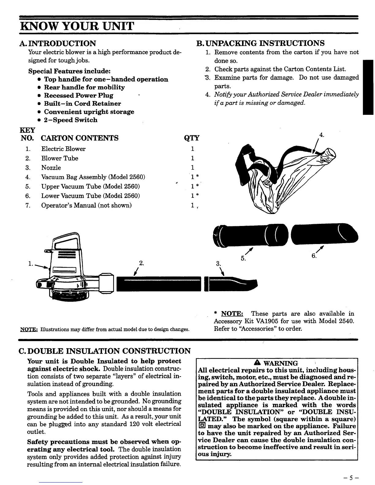 Weed Eater 2540 - KNOW YOUR UNIT; A. INTRODUCTION; B. UNPACKING INSTRUCTIONS; C. DOUBLE INSULATION CONSTRUCTION