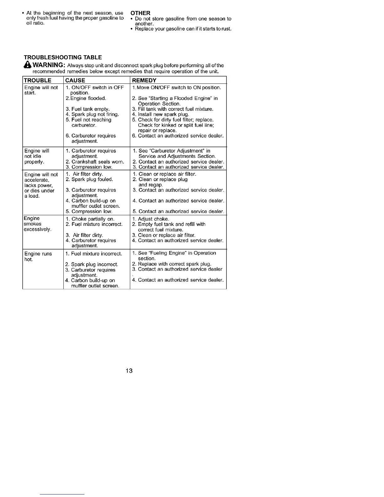 WARNING: Always stop unit and disconnect spark plug before performing all of the