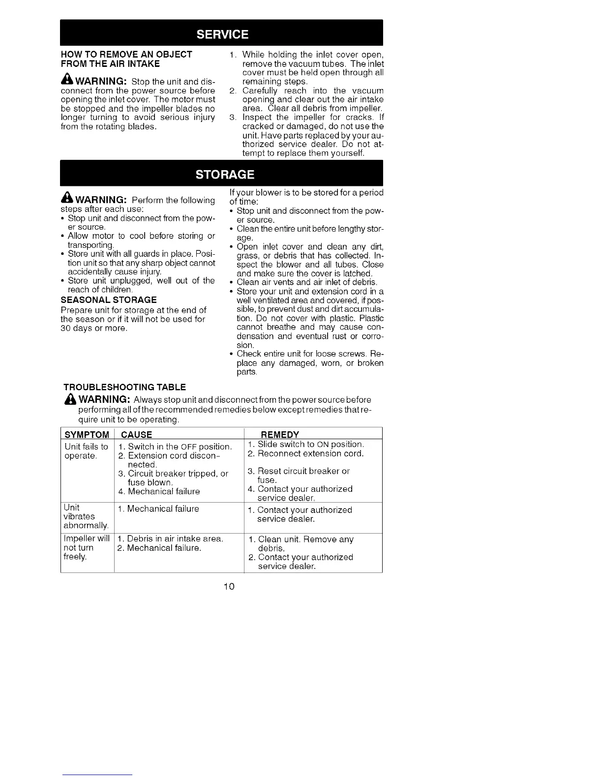 Impeller will 1. Debris in air intake area. 1. Clean unit. Remove any