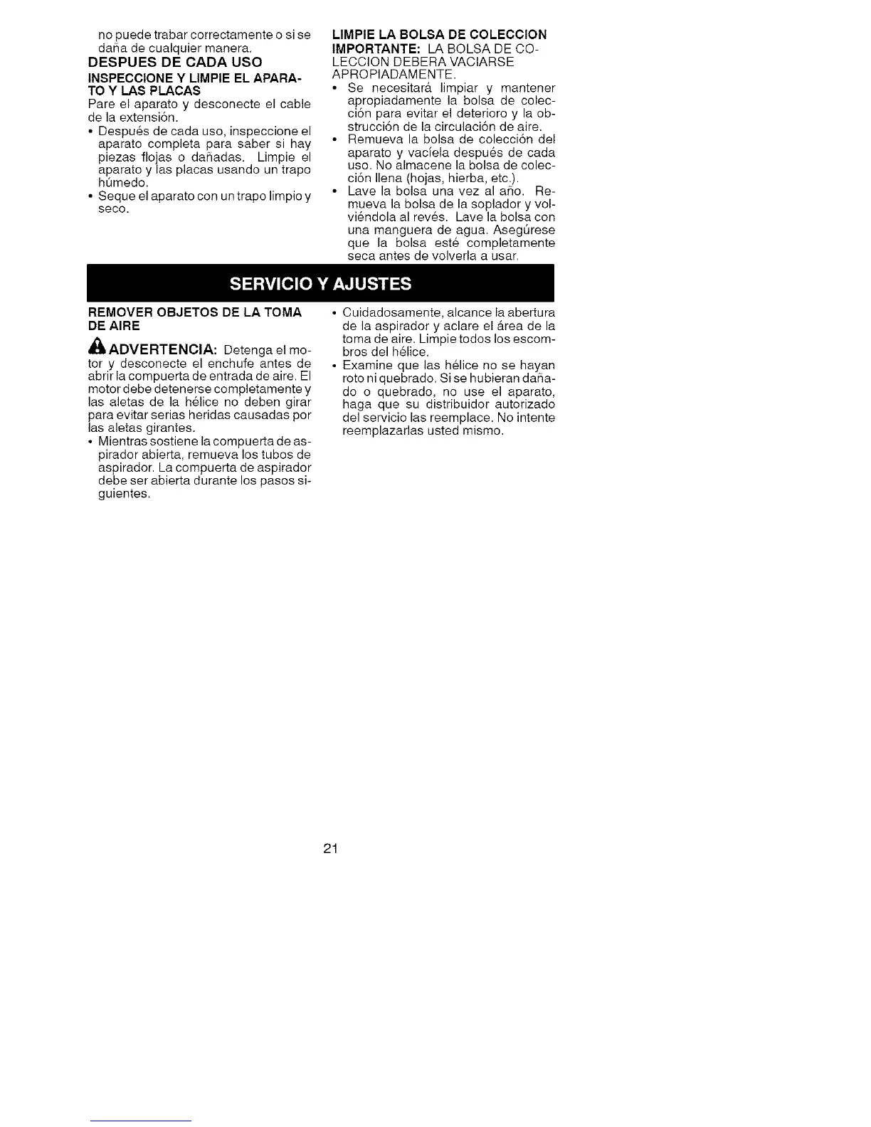 • Remueva la bolsa de colecci6n del