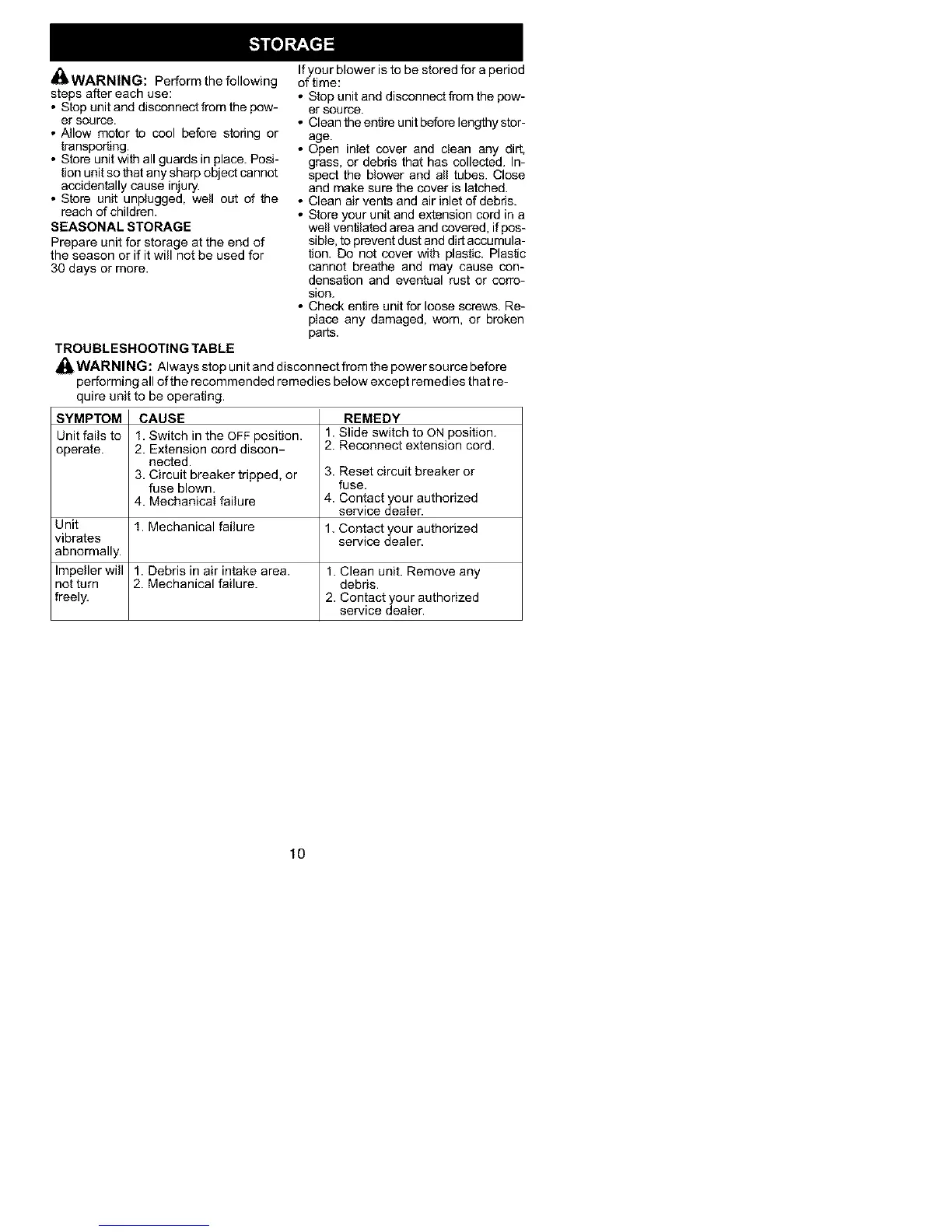 Impeller will 1. Debris in air intake area. 1. Clean unit. Remove any