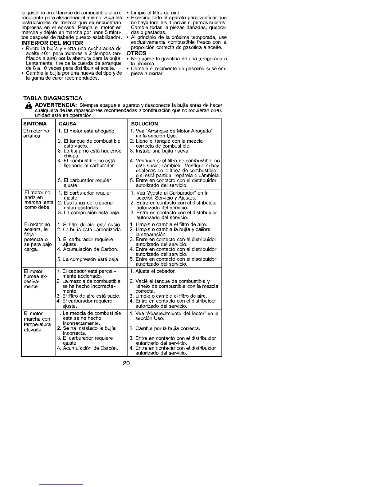friados a aire) por la abertura para la bujia. • No guarde la gasolina de una temporada a