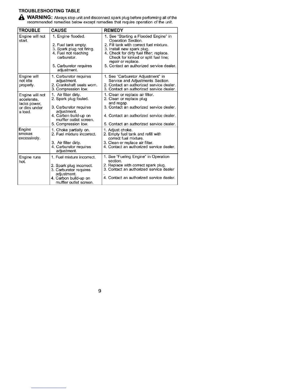 5• Carburetor requires 5. Contact an authorized service dealer.
