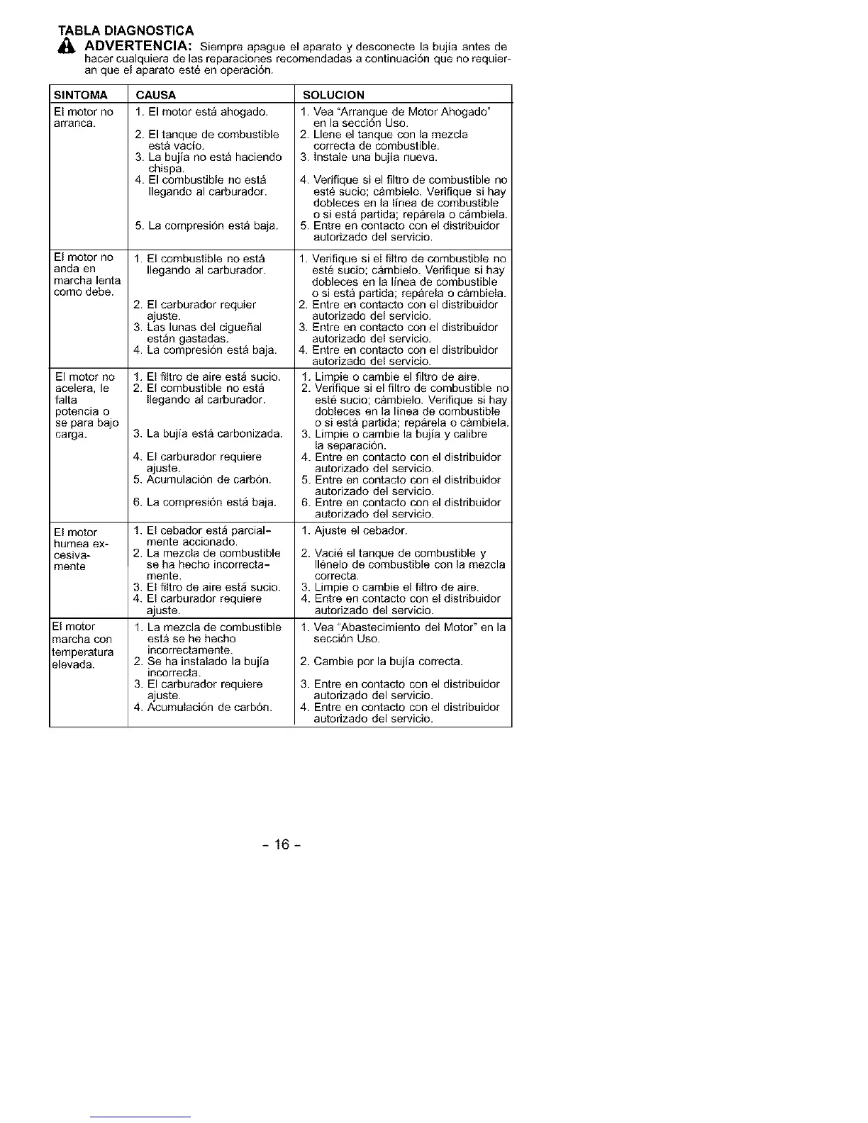 ADVERTENCIA: Siempre apague el aparato y desconecte la bujia antes de