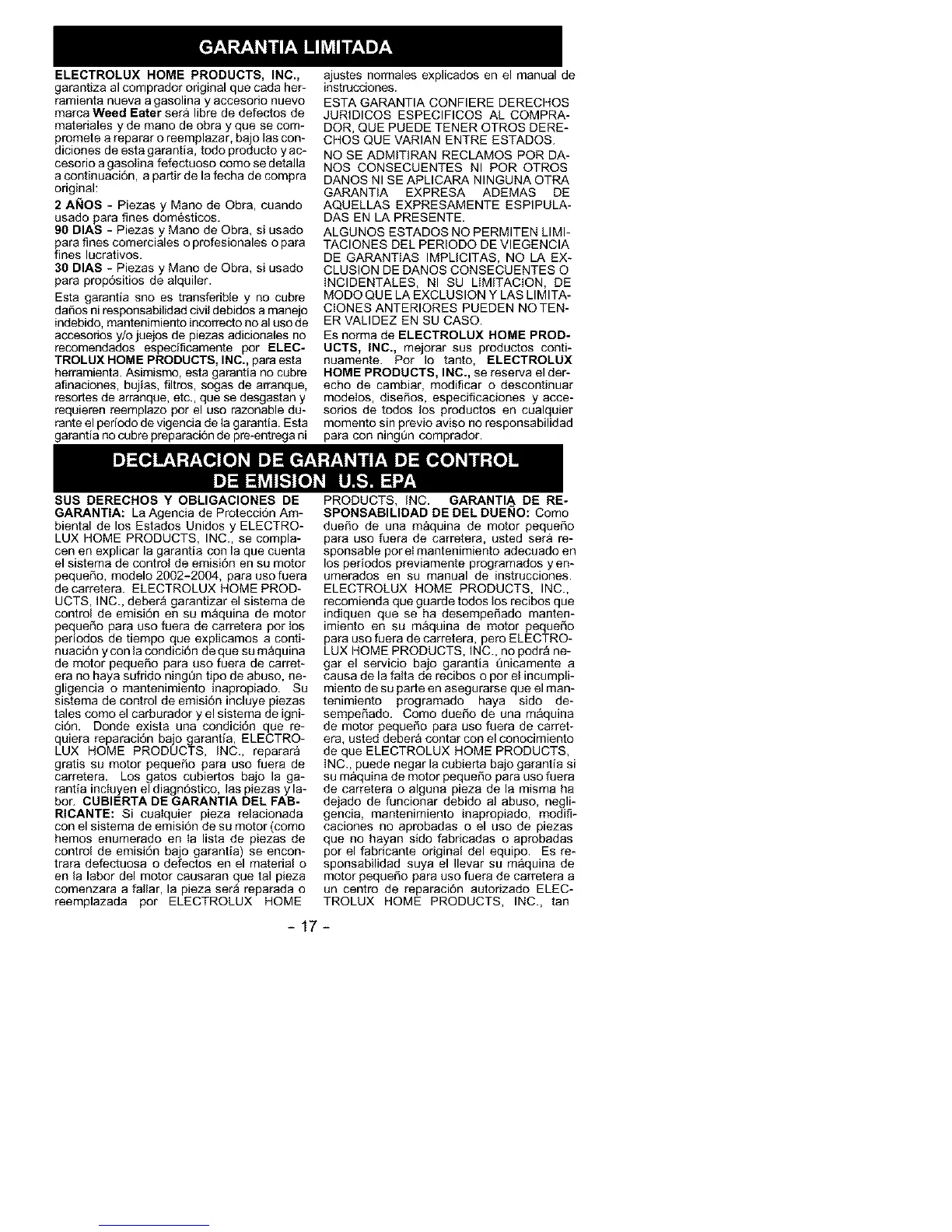 marca Weed Eater sera libre de defectos de