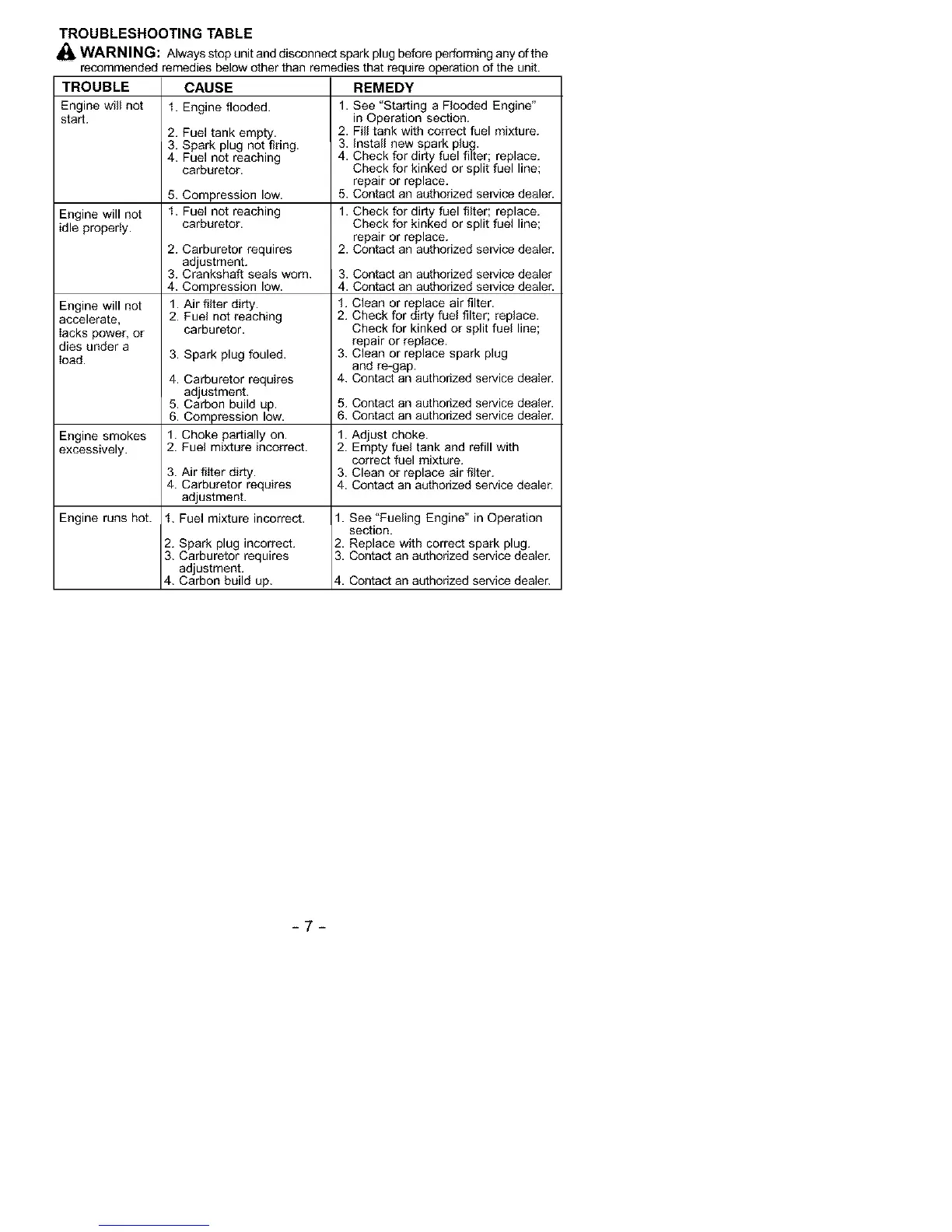 2. Carburetor requires 2. Contact an authorized service dealer.