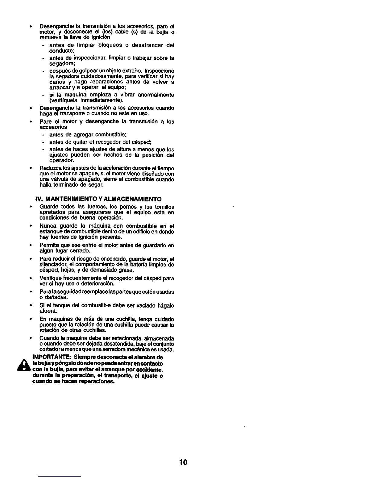 • Desengancha la transmisi6n a los accesorios, pare el