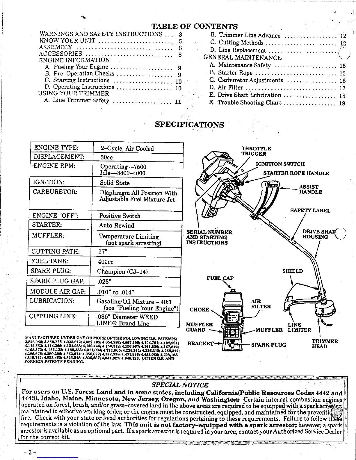 Weed Eater GTI 16 SUPER - Table of Contents; Specifications; Special Notice
