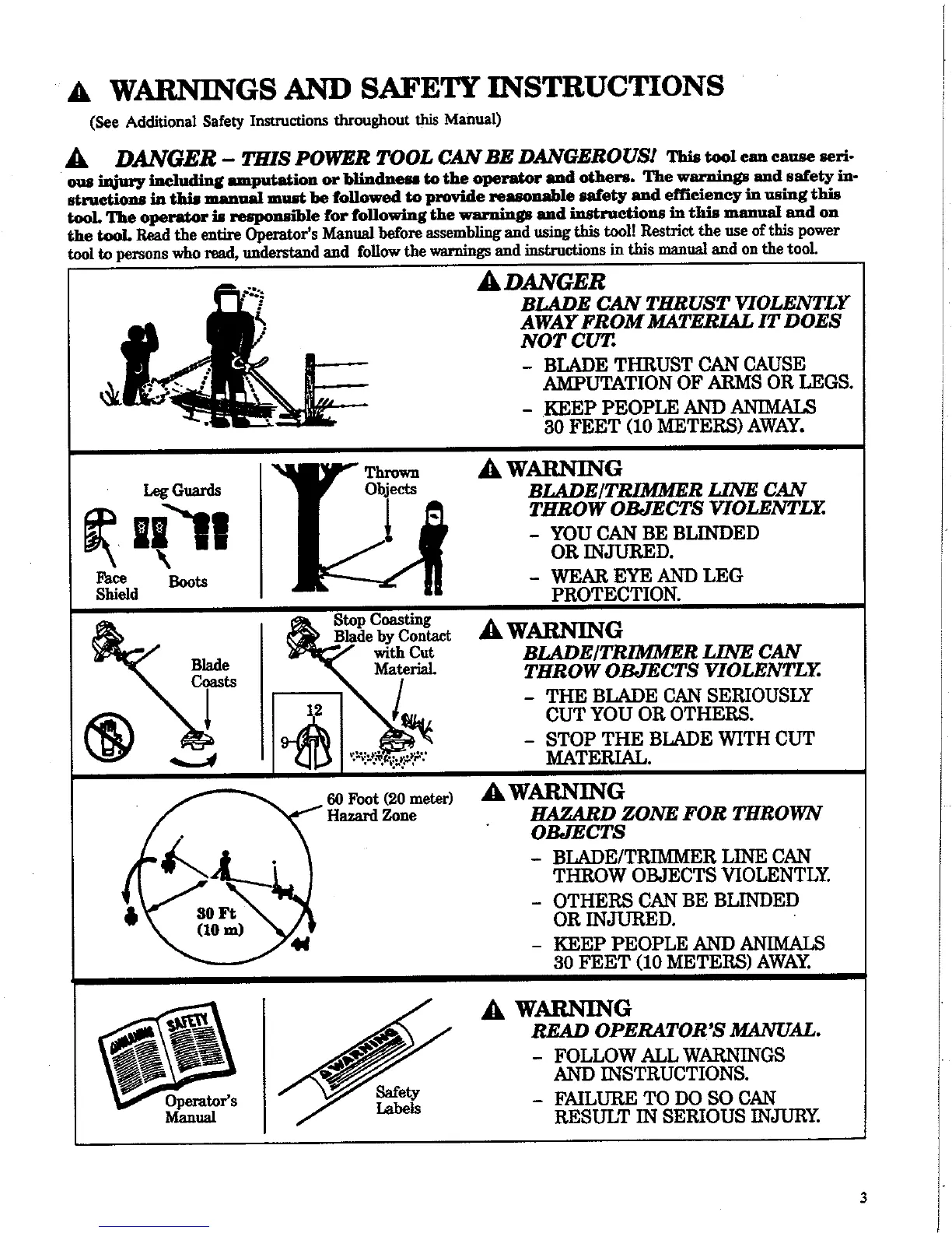 Weed Eater GTI 19 - Safety Instructions; General Tool Dangers; Blade and Object Hazards; Operator Responsibilities