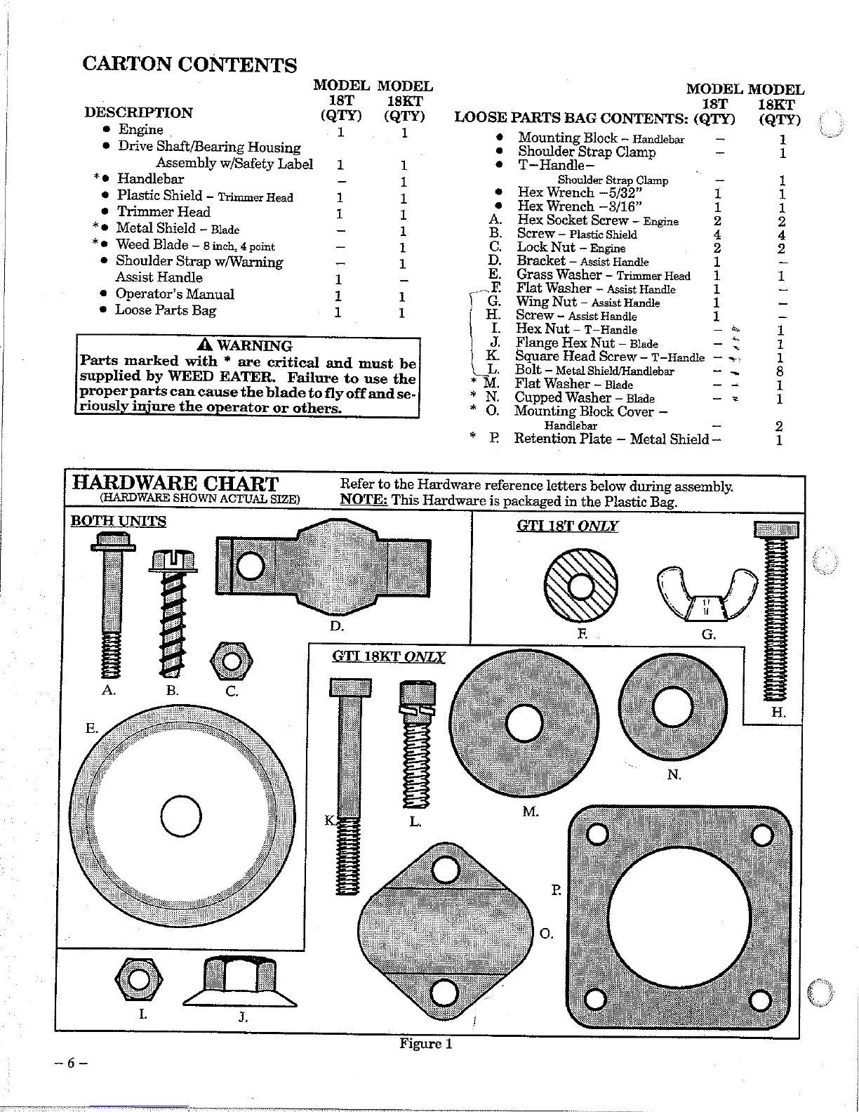 Weed Eater GTI18KT - Carton Contents; Hardware Chart